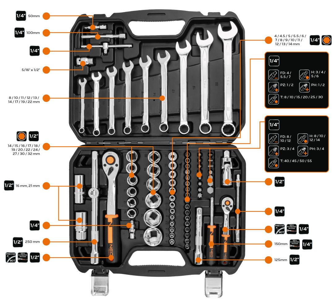 - торцеві головки, ключ-тріскачка, подовжувач, вороток, перехідник, шарнір, змінні наконечники, кейс, рожково-накидні ключі, рукоятка
