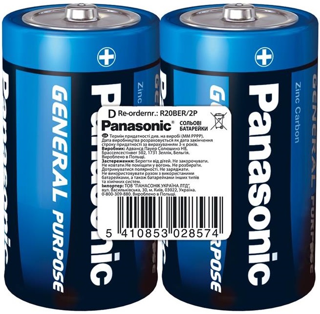 Описание Батарейка Panasonic GENERAL PURPOSE вугільно-цинкова D(R20) плівка, 2 шт. код товару R20BER/2P