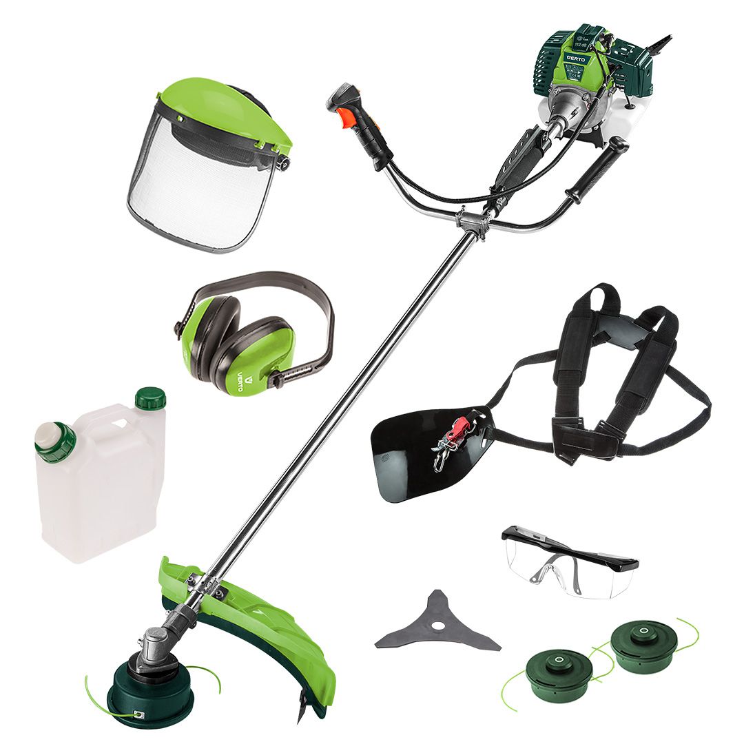 - Захисні окуляри, захисний кожух, плечовий ремінь, ручка, тример садовий, шпулі з волосінню, лезо-тризуб, болти та гайки, скоби для перенесення, ключ з викруткою, шестигранні ключі, гайковий ключ, викрутка, ємність для паливно-мастильної суміші, щиток плас ,