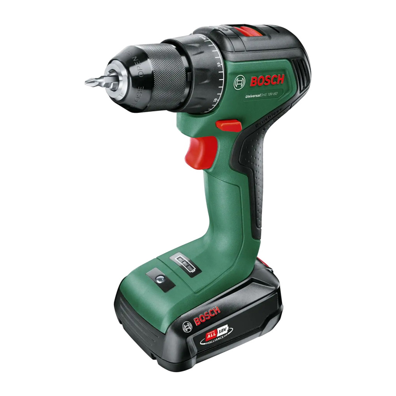 Описание аккумуляторной дрели-шуруповерта Bosch UniversalDrill 18V-60:Эффективный инструмент домашнего использования справится с заворачиванием креплений, сверлением отверстий в древесине, стали или пластике.1.3-килограммовая дрель-шуруповерт компактно умещается в руке мастера, помогает качественно удерживать инструмент прорезиненная вставка.Им легко работать в труднодоступных местах, настроить крутящий момент (20 положений) и скорость (2) в соответствии с заданием.Система защищена от перегрузок, чрезмерного нагрева механизма.Индикатор уровня зарядки указывает на длительное использование (зеленый цвет), необходимость заменить аккумулятор (горит красная лампочка).Хранить и транспортировать комплект удобно в пластиковом кейсе.