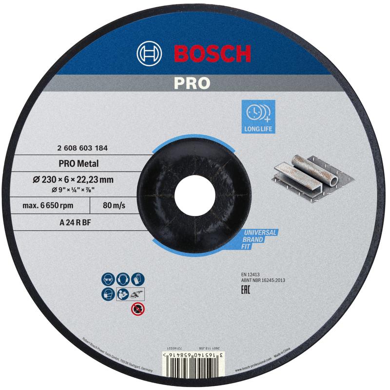 Описание BOSCH Армированный шлифовальный диск PRO Metal для больших угловых шлифмашин, диаметр отверстия 22,23 мм, код товару 3165140658416