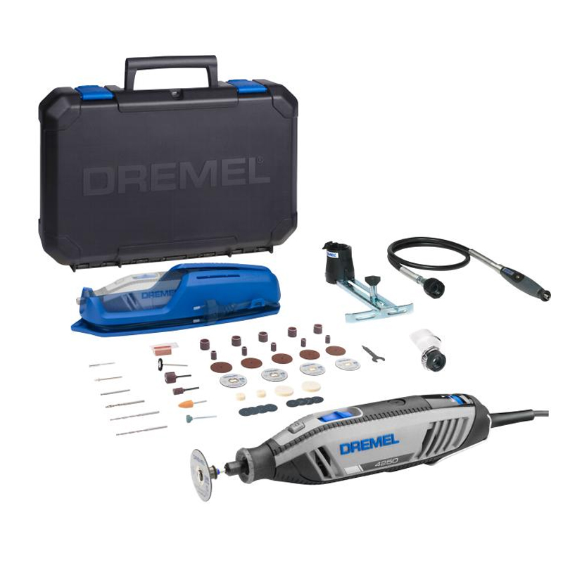 Удобство пользователяВысокая производительность для сложных задач. Dremel 4250 – самый высокопроизводительный сетевой инструмент в линейке Dremel.Режьте, сверлите, шлифуйте, затачивайте, полируйте и гравируйте с помощью 45 высококачественных насадок Dremel, входящих в комплект поставки.Кейс позволяет легко переносить и хранить все насадки и приставки. Для частого применения используйте настенное крепление.Расширьте возможности инструмента с помощью гибкого вала (225).Универсальная направляющая для резки (565) и фрезерный циркуль с параллельным упором (678) помогут выполнить задачи, требующие высокой точности.