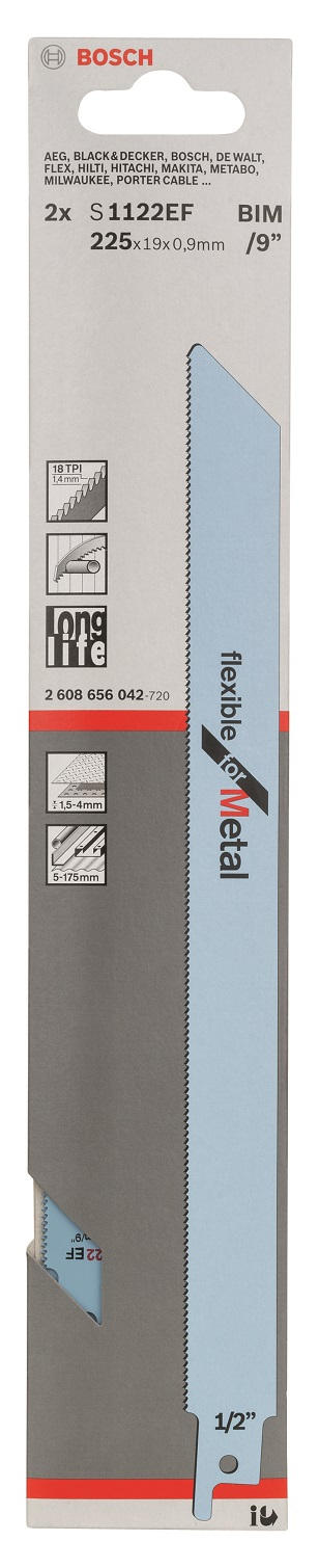 Характеристики Bosch Полотно пиляльне для шабельної пилки по металу, S 1122 EF, 18TPI, 2шт код товару 2.608.656.042