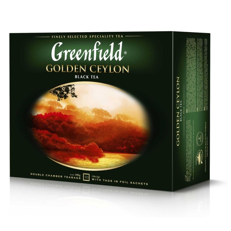 Чорний чай. Greenfield Golden Ceylon чорний цейлонський чай з провінції Ругуну. У яскравій палітрі цього відмінного чаю тонкі відтінки поєднуються з силою і повнотою смаку. Вишуканий аромат, властивий цінних сортів цейлонського чаю, підкреслює благородство Грінфілд Голден Цейлон. Фасовка: 50 пакетиків з ярликами в індивідуальній упаковці.