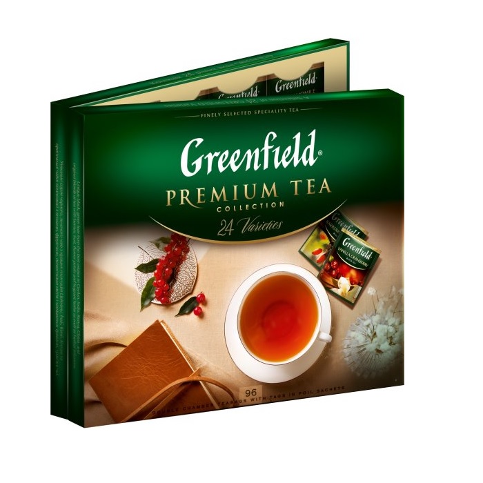 Набір чаю Greenfield Premium tea Collection включає в себе рідкісні сорти чорного, зеленого чаю з кращих плантацій Цейлону, Індії, Кенії і Китаю і оригінальні чайні композиції з ягодами, фруктами, пелюстками квітів і запашними травами, трав'яні чаї. У наборі представлені зразки класичної колекції Greeenfield, такі як насичений і яскравий Golden Ceylon, Magic Yunnan з димним ароматом, терпкий і пряний English Edition, чудовий Kenyan Sunrise, тонізуючий Classic Breakfast, благородний зелений чай Flying Dragon, знаменитий жасминовий чай Jasmine Dream, блискучий Earl Grey Fantasy. Також представлений чай з гербальной колекції Greenfield, такий як легкий Lemon Spark, яскравий Barberry Garden, ніжний Blueberry Nights і Currant & Mint, делікатний Floral Cloud, різдвяний Christmas Mystery, свіжий Spring Melody, ванільний Vanilla Cranberry, полунично-шоколадний Strawberry Gourmet, освіжаючий Green Melissa, літні Summer Bouquet і Festive Grape, солодкуватий Rich Camomile, екзотичний Tropical Marvel і Wildberry Rooibos з природним солодкуватим смаком, медовий Honey Linden. Фасовка: 96 пакетиків з ярликами в індивідуальній упаковці, 24 види по 4 шт кожного.