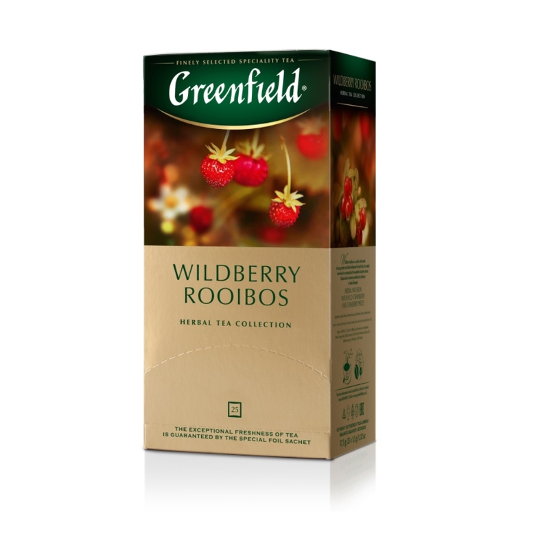 Солодкуватий смак етнічного напою Greenfield Wildberry Rooibos з молодих пагонів південноафриканського куща Ройбуш стає ще більш виразним завдяки чудовому аромату суниці.