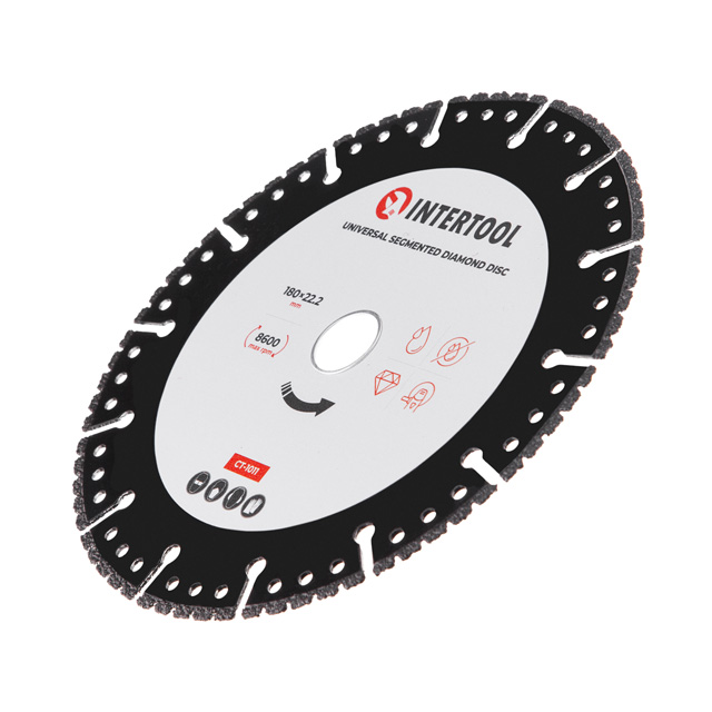 Диск діаметром 180 мм створений для ефективного різання різноманітних матеріалів, таких як дерево, бетон, камінь, цегла, граніт, пластик тощо. Виготовлений з високоякісного алмазного матеріалу, має високу міцність і довговічність, що робить його ідеальним інструментом для різноманітних будівельних і ремонтних робіт. Призначений для використання з кутовими шліфмашинами (болгарками) із високою швидкістю обертання - до 8600 об/хв.