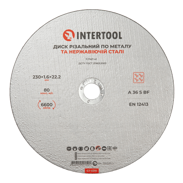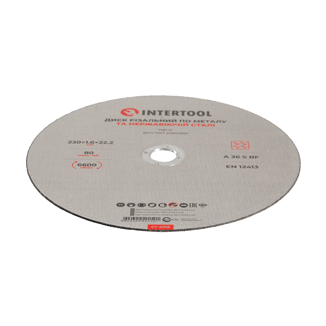 Характеристики Отрезной диск по металлу 230x1,6x22,2 мм INTERTOOL CT-4015 код товару CT-4015