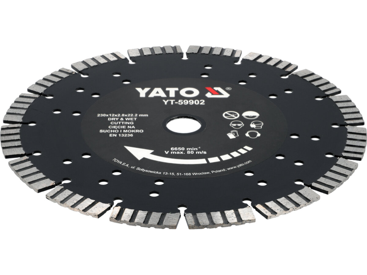 Описание Диск відрізний алмазний по залізобетону і камінню YATO Ø=230/22.2х 2.8 мм, в мокрому і сухому режимі код товару YT-59902