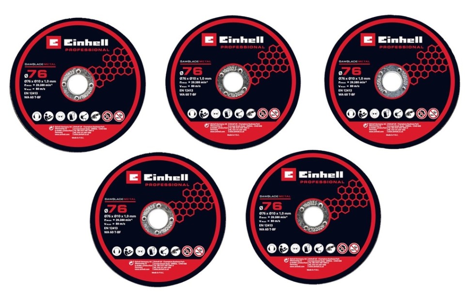 Набір з 5 відрізних дисків Einhell 4440471 з діаметром 76 мм та товщиною 10 мм призначений для різання металу в акумуляторному інструменті TP-CO 18/76-C Li BL. Тонкий профіль забезпечує чистий зріз без іскор на сталі чи профілях. Сумісність з моделлю дозволяє встановлювати без адаптерів. Цей елемент полегшує монтаж у автосервісах чи будівництві. Матеріал стійкий до зносу для тривалої роботи.