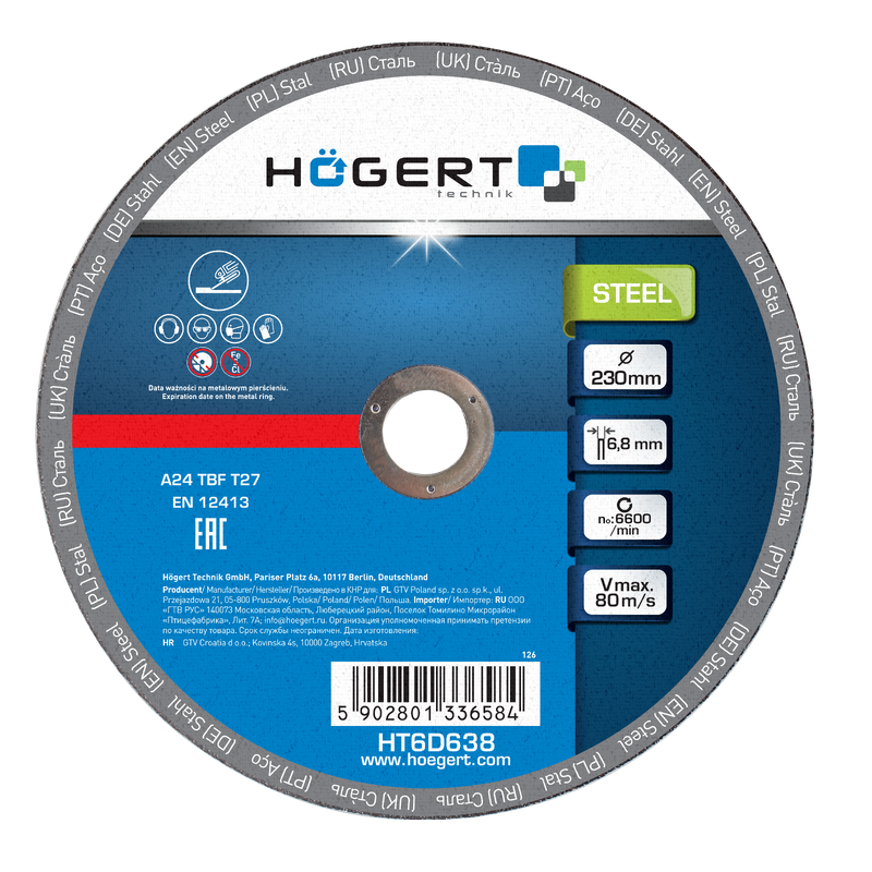 Характеристики:• Товщина 6,8 мм• Призначення по сталі• Допустимі обороти 6600 за хвилину, 8500 за хвилину• Діаметр 230 мм• Максимальна робоча швидкість 80 м/с