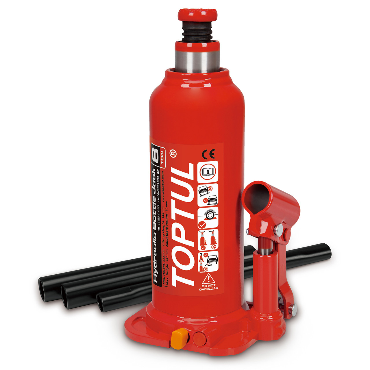 Характеристики Домкрат бутылочный гидравлический 8т 222-447 мм TOPTUL JHAB0108 код товару JHAB0108