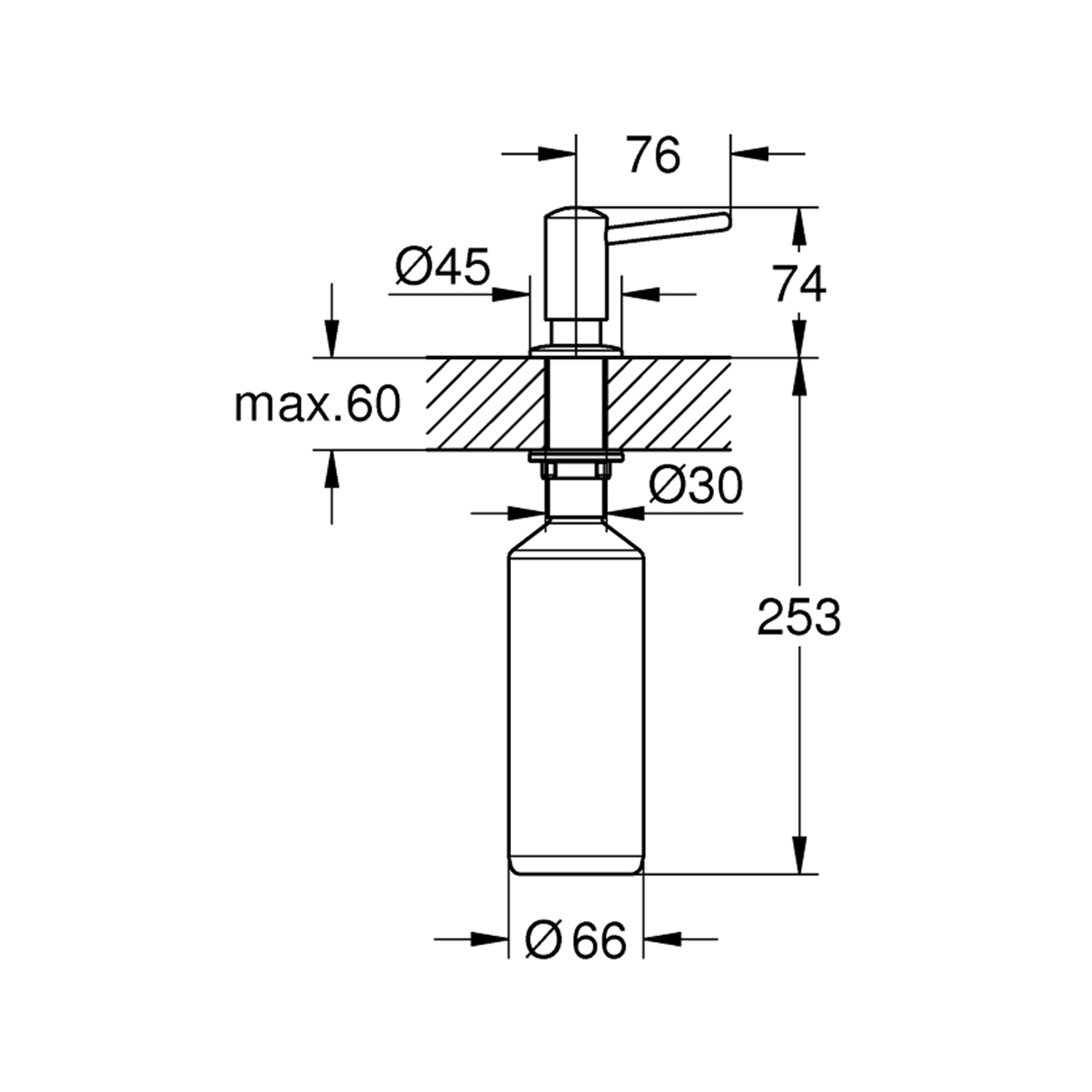 Флакон объемом 500 мл скрывается под столешницей, экономя место вокруг мойки и повышая уровень гигиены — любимое мыло всегда под рукой. Удобное использование даже грязными руками: нажимать можно как рукой, так и локтем.