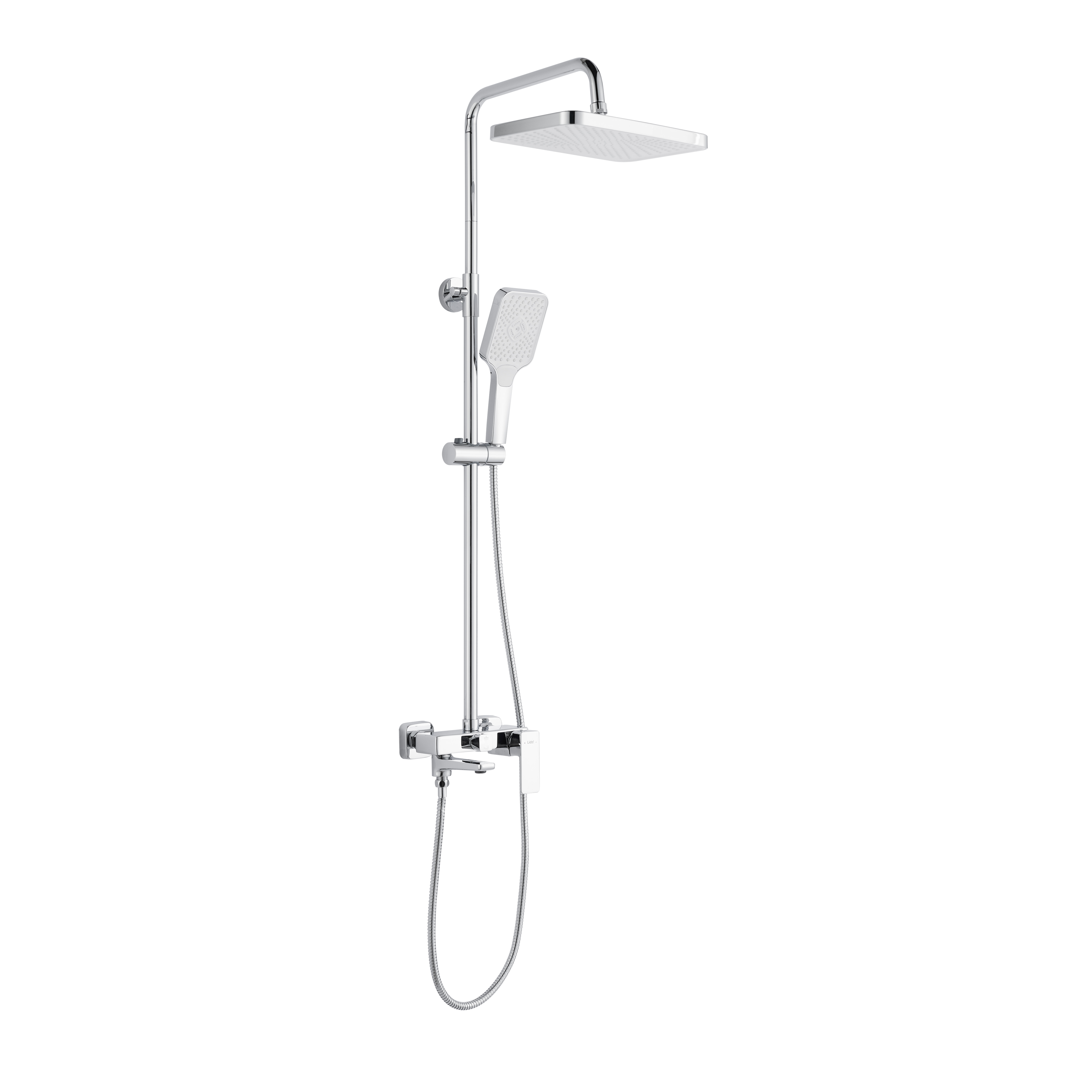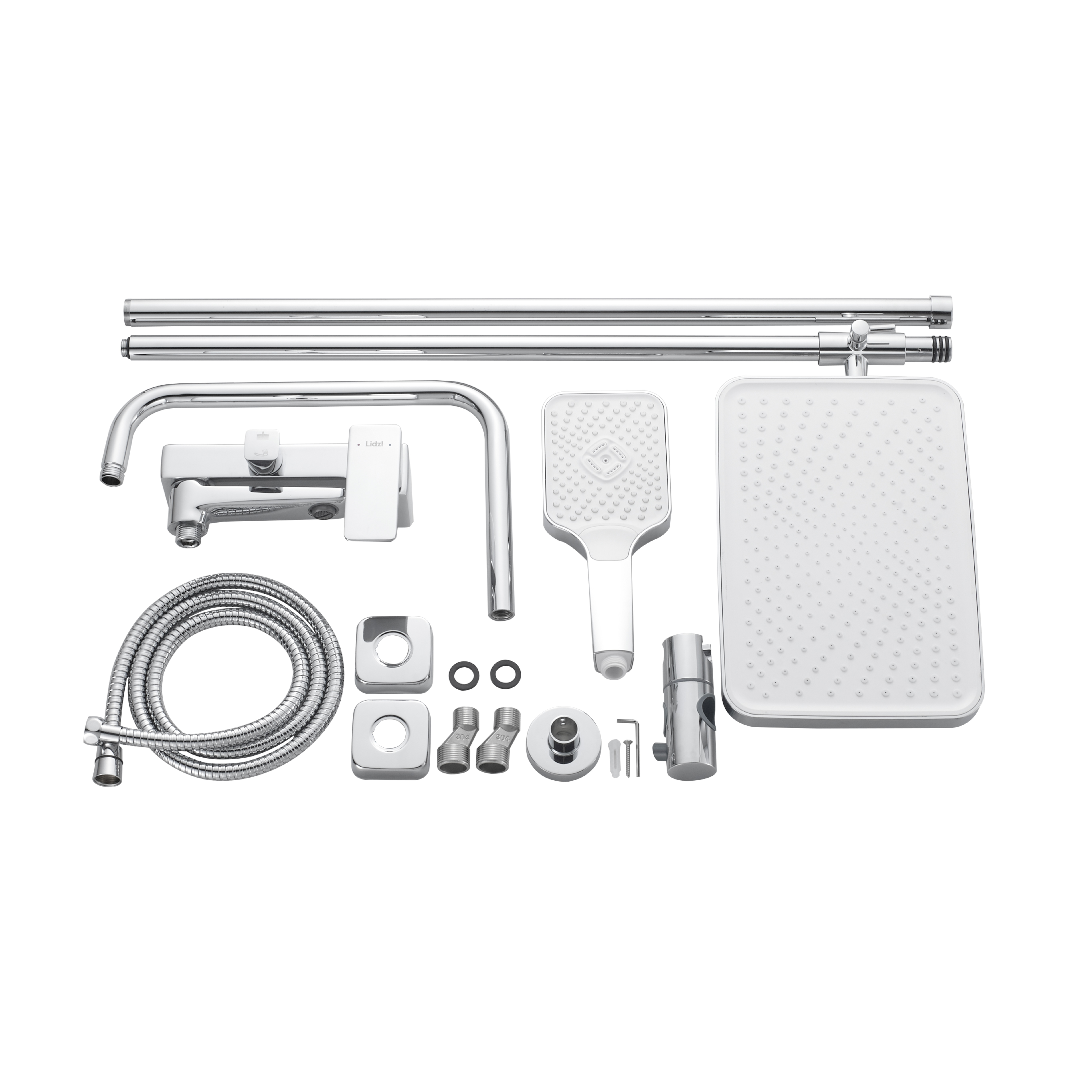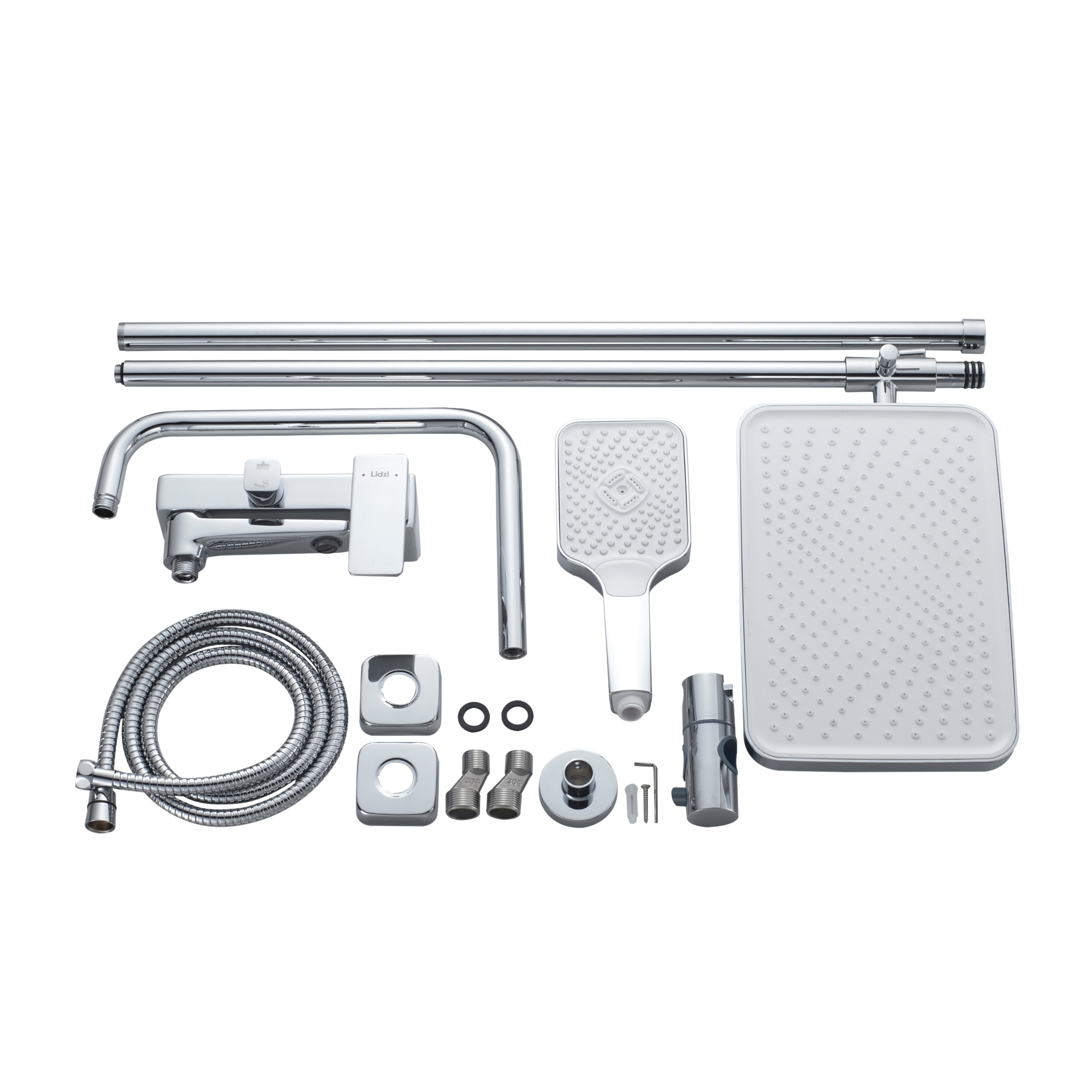 Смеситель, излив, душевая стойка - 3 секции, верхняя лейка, ручная лейка, душевой шланг, декоративные чашки (розетки) - 2 шт, эксцентрики (переходники) - 2 шт, уплотнительные прокладки - 2 шт, держатель для ручной лейки, крепёж для стойки и держателя.