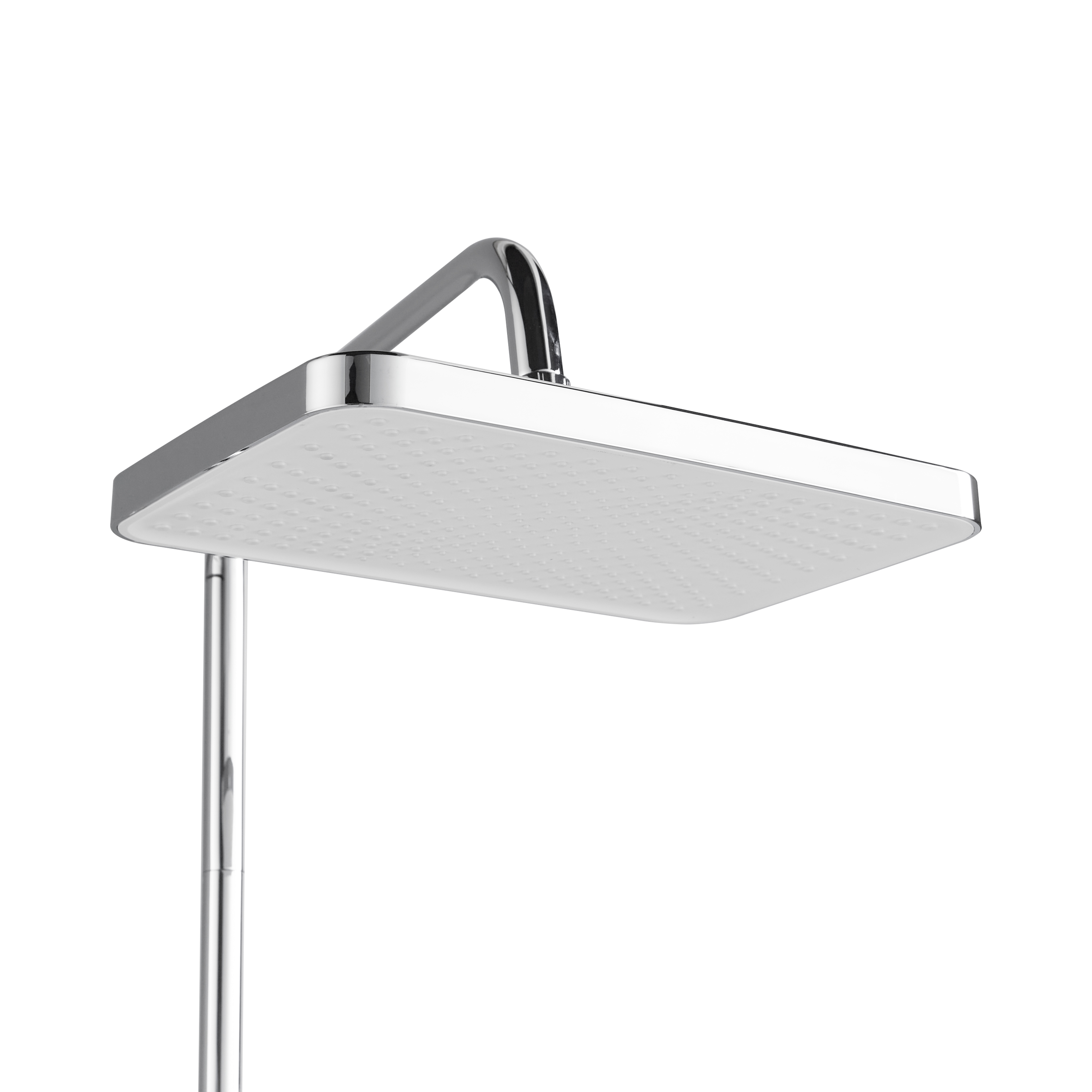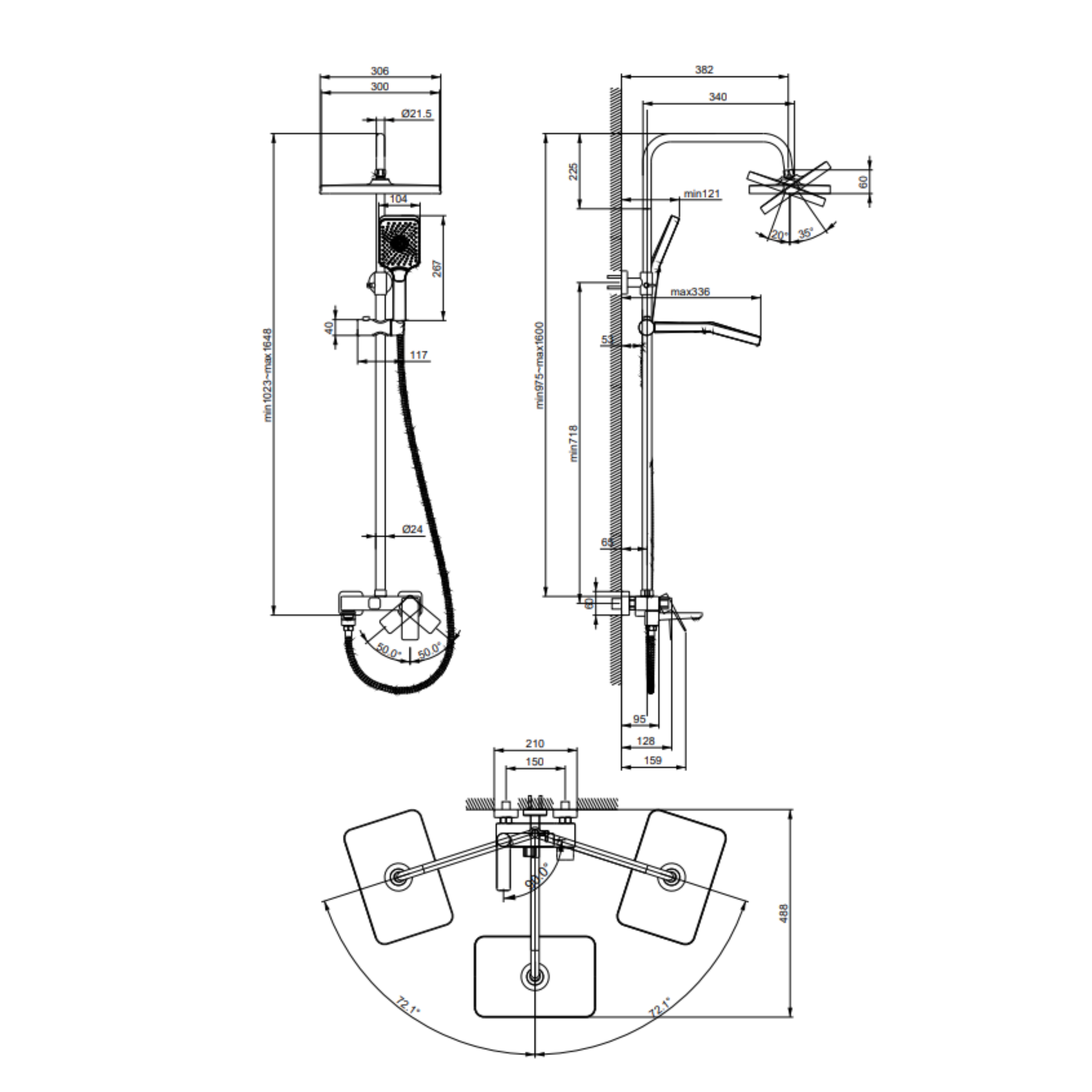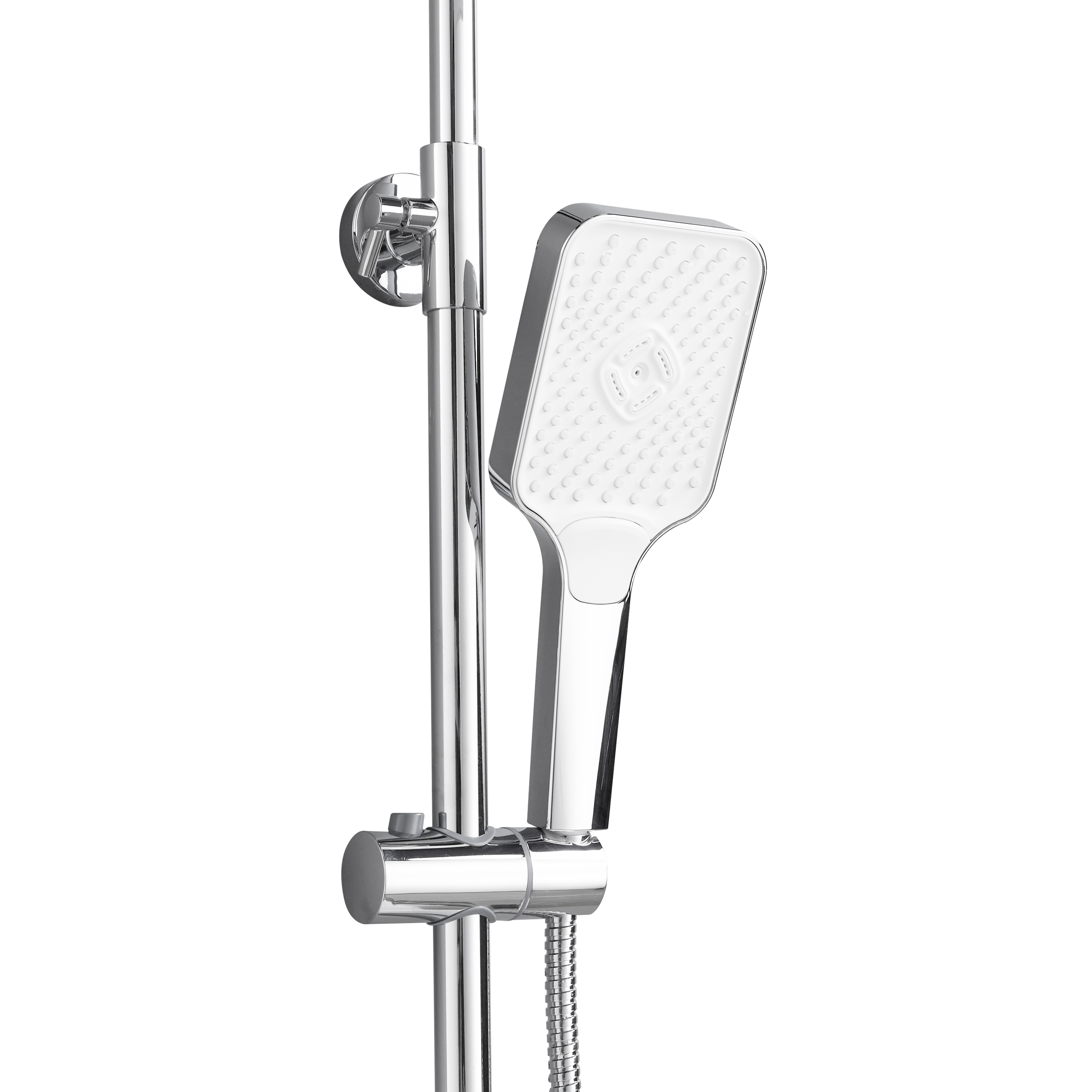 Смеситель, излив, душевая стойка - 3 секции, верхняя лейка, ручная лейка, душевой шланг, декоративные чашки (розетки) - 2 шт, эксцентрики (переходники) - 2 шт, уплотнительные прокладки - 2 шт, держатель для ручной лейки, крепёж для стойки и держателя.