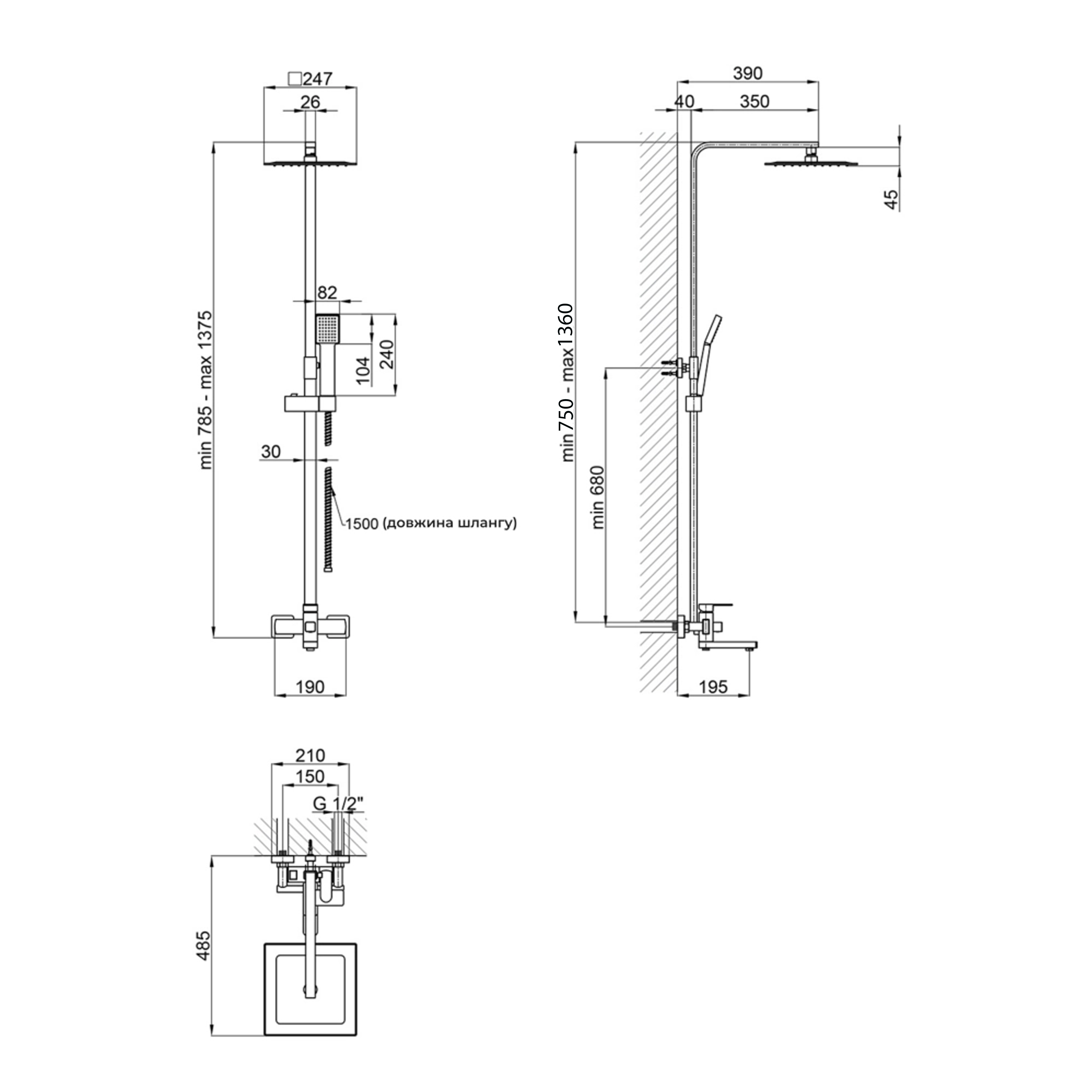 Высота душевой стойки, мм