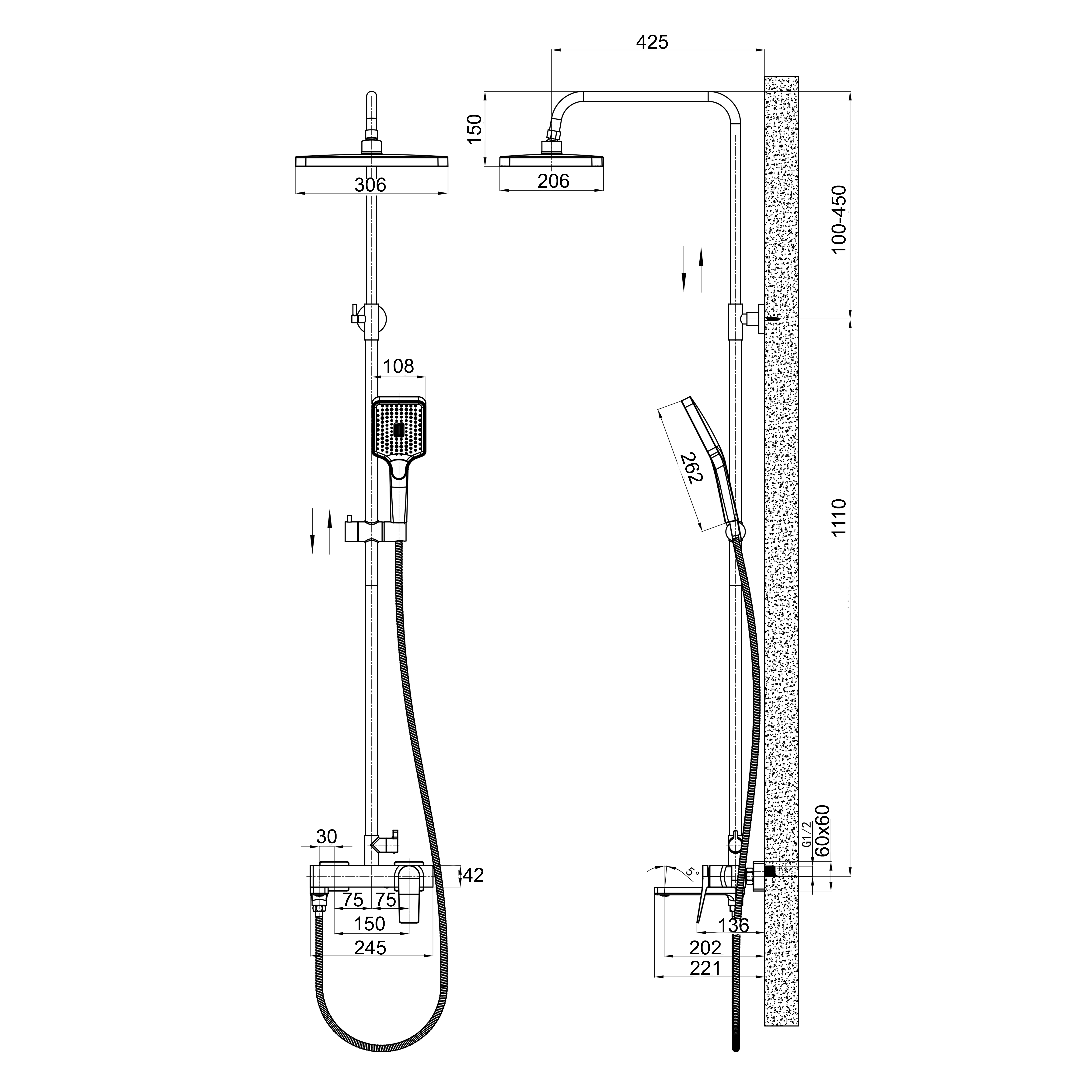 - Ручной душ: 150х110. Верхний душ: 300х200