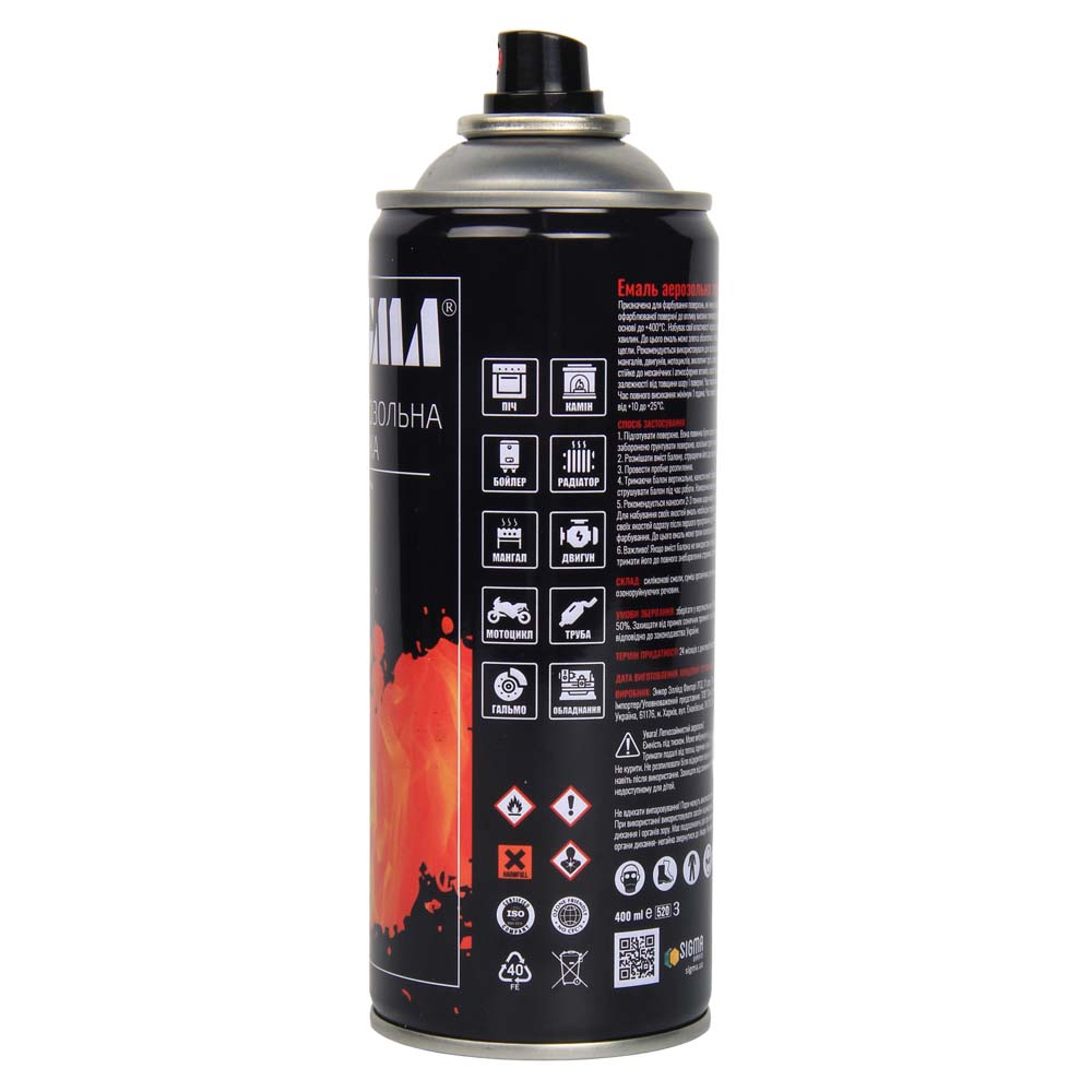 Характеристики Эмаль акриловая термостойкая аэрозоль 400мл RAL 9005 черный мат SIGMA код товару 2736041