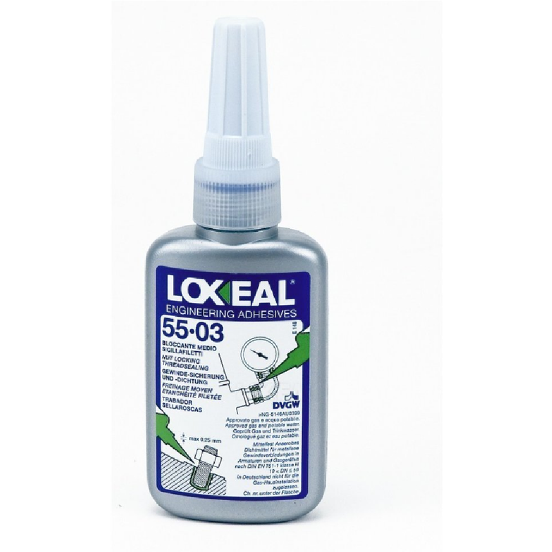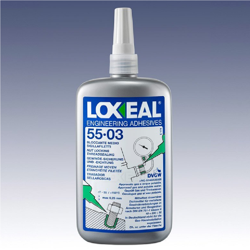 ОПИСАНИЕ:LOXEAL 55-03 – однокомпонентный анаэробный клей средней прочности для фиксации болтов, гаек, в соединениях, которые подлежат периодическому демонтажу. Соединение при необходимости можно разобрать обычным ручным инструментом. Устойчив к теплу, коррозии, вибрации, воде, газу, нефти, углеводородам и другим химическим веществам. Одновременно фиксирует и герметизирует резьбу, можно применять на замасленной поверхности. Сертифицирован для газа и питьевой воды.РЕКОМЕНДАЦИИ ПО ПРИМЕНЕНИЮ:Для получения наилучших результатов склеиваемые поверхности должны быть чистыми и обезжиренными. При рименяется даже на слегка замасленной поверхности. Продукт сертифицирован для воды (KTW, DVGW) и газа (DVGW). Продукт LOXEAL 55-03 (Локсеаль 55-03) наносится на внешнюю резьбовую часть в количестве, достаточном для заполнения резьбового зазора. Чрезмерно большие диаметры резьб и резьбовые зазоры могут негативно повлиять на прочность и скорость полимеризации. Продукт не рекомендуется наносить на поверхности из термопласта, поскольку возможно разрушение такого материала. При необходимости такого применения необходимо предварительно проверить совместимость продукта с материалом поверхностей.