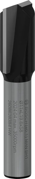 Твердосплавна пазовая фреза з хвостовиком 8 мм діаметром 11 мм, робочою довжиною 20 мм та загальною — 51 мм — робоча насадка до вертикально-фрезерних машин. З двома ріжучими кромками ця фреза філігранно вирізає невеликі пази під з'єднання, декоративні виїмки та шліци для прокладки ущільнювачів у деревині, листових, полімерних та абразивних матеріалах, наприклад, Corian®. Нею зручно обробляти предмети та деталі будь-якої конфігурації.