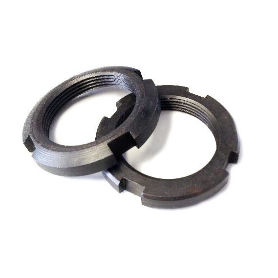 DIN 1804 Гайка шліцева кругла з метричним дрібним різьбленням. Кількість пазів залежно від розміру діаметра: М6 – М42 = 4 пази, М45 – М120 = 6 пазів, М125 – М200 = 8 пазів під ключ для шліцевої гайки згідно з DIN 1810.