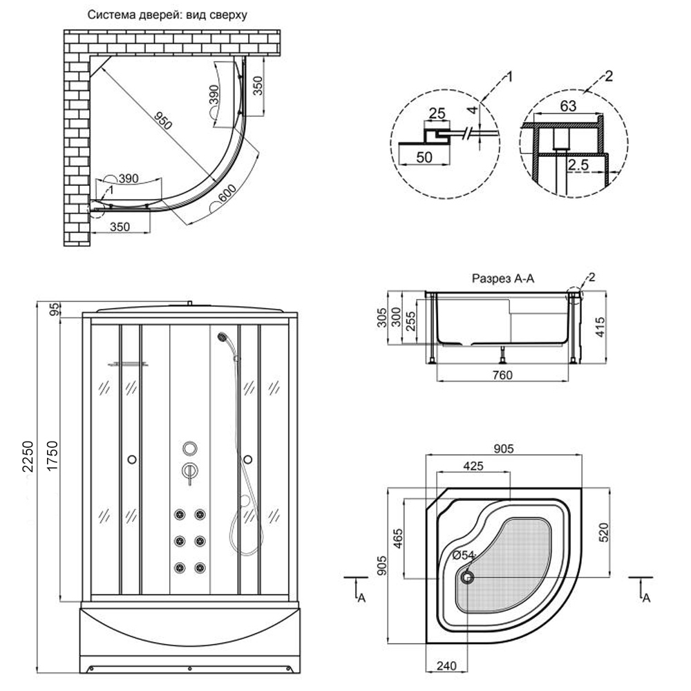 - Встроенное сиденье. Количество душевых форсунок: 6. Прямоугольная стеклянная полка.