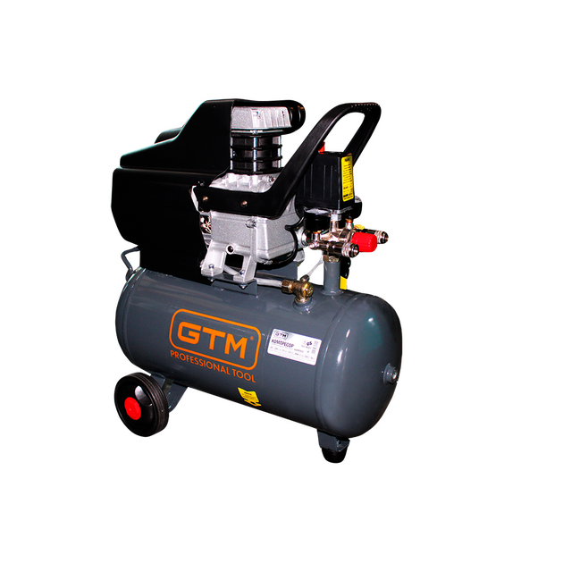 GTM KABM2024 - надійний і продуктивний компресор побутового класу з робочим тиском 8 бар. Завдяки високій продуктивності та швидкості накачування підходить для більшості базових завдань: продування поверхонь, підкачування коліс, під'єднання аерографів, фарборозпилювачів і малого пневмоінструменту.