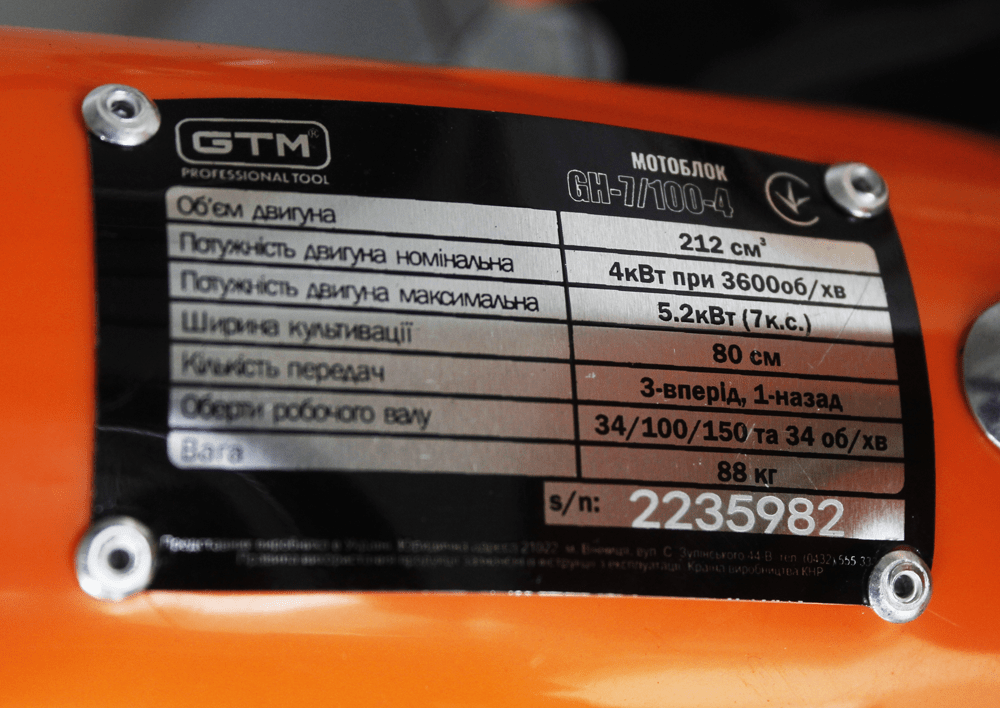 GTM GH-7/100-4 - садова техніка побутового класу для обробки землі, оранки грядок та городів середньої площі. Дана модель мотоблока оснащена бензиновим двигуном з потужністю 7 л.с (5,2 кВт) зі збільшеним крутним моментом для кращої роботи. Ширину культивації під час роботи можна регулювати від 600 мм до 1000 мм, залежно від ширини грядки.