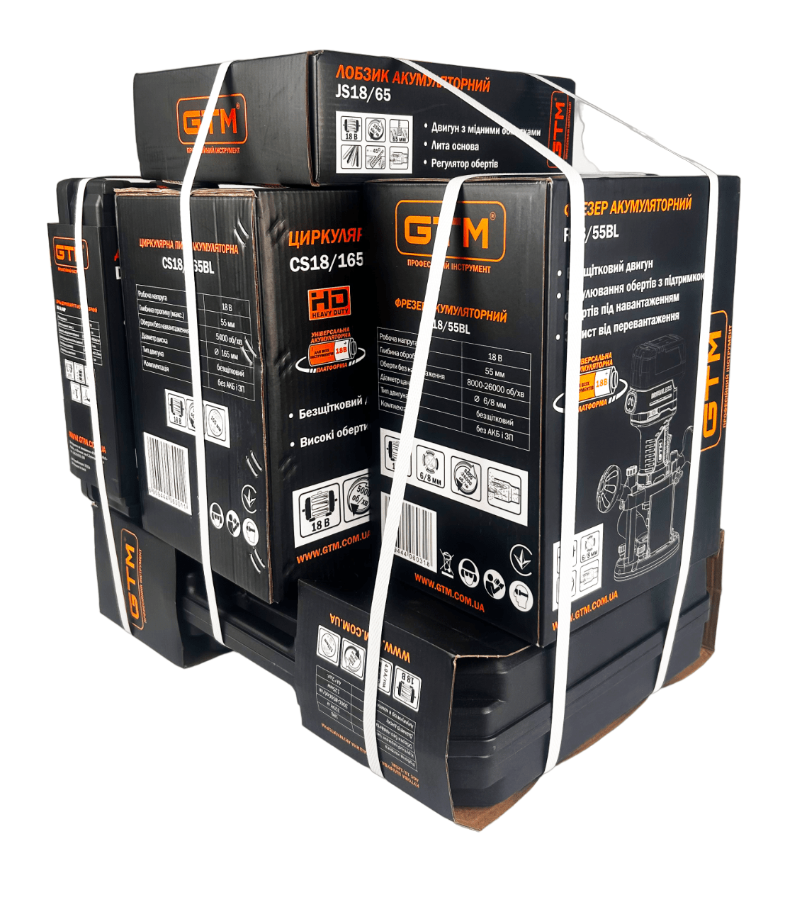 GTM PROMO_4 - лімітований набір акумуляторного інструменту, для виконання основних завдань з ремонту. До комплекту входять потужний акумуляторний шурупокрут DS18/40P, лобзик JS18/65, болгарка AGC18/125BL, фрезер R18/55BL, дискова пила CS18/165BL, 2 Li-on акумулятори ємністю 2 А*год, 2 Li-on акумулятори ємністю 4 А*год і зарядний пристрій.