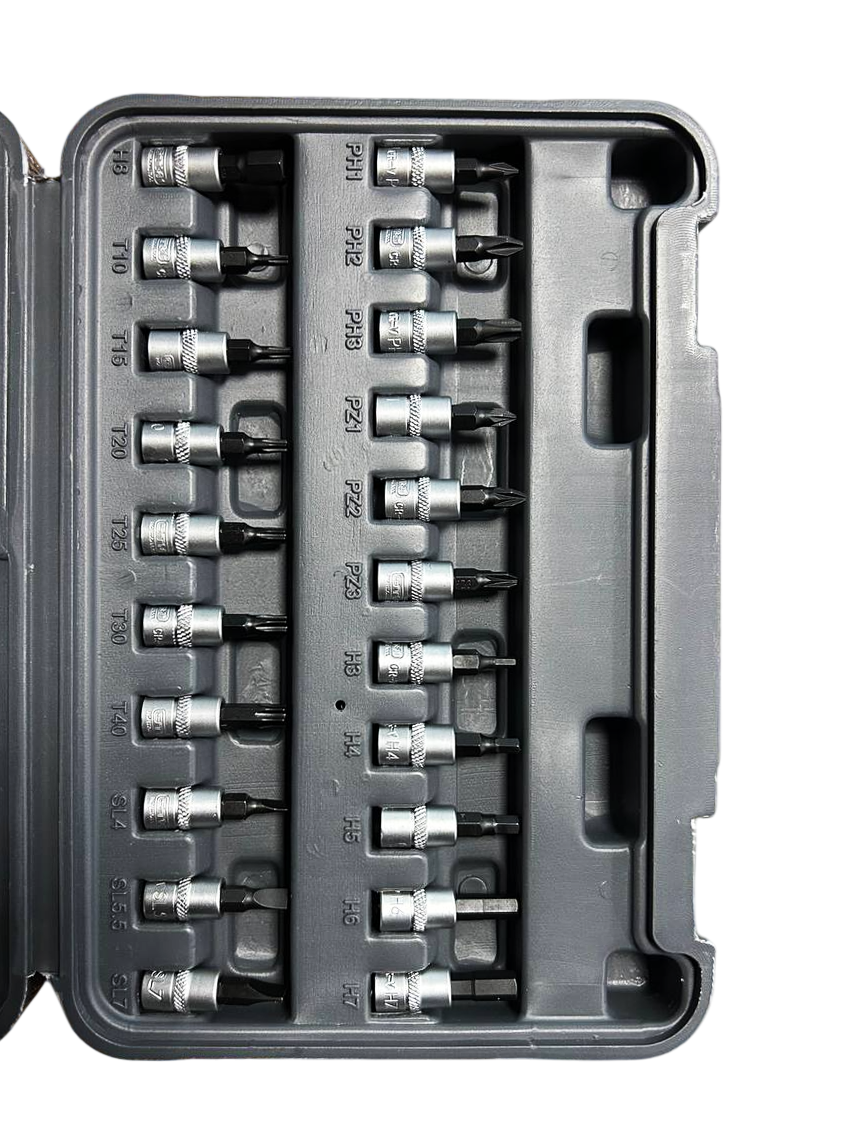 Торцеві біти 1/4"": PH: 1, 2, 3 PZ: 1, 2, 3 HEX: 3, 4, 5, 6, 7, 8 SL: 4, 5.5, 7 T: 8, 10, 15, 20, 25, 30, 40
