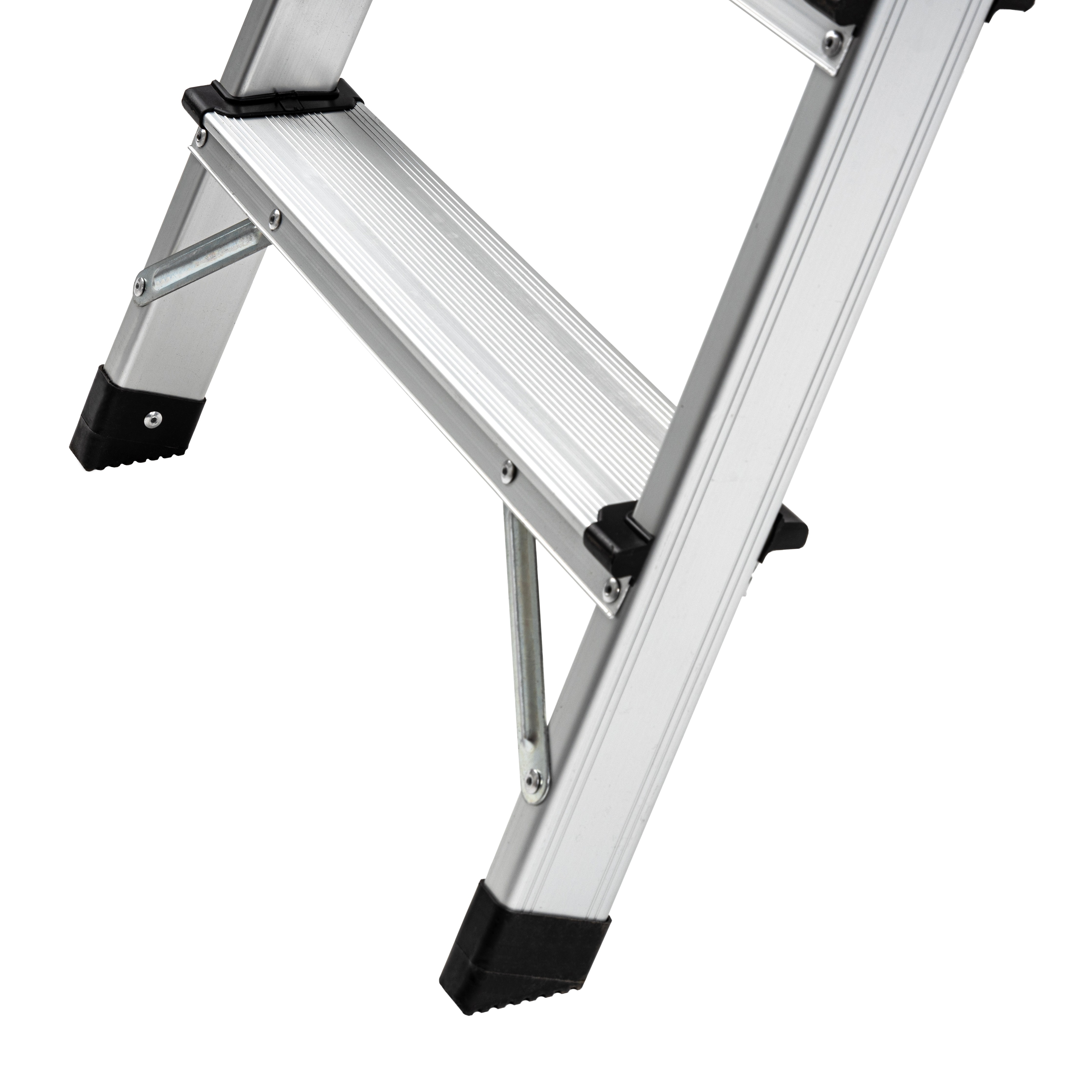 GTM KMH1204 - компактна алюмінієва драбина у формі двосторонньої стрем'янки, яка чудово підходить як для побутового, так і для професійного використання. У даній моделі драбини 4 сходинки і максимальна висота до верхньої сходинки 78 см.