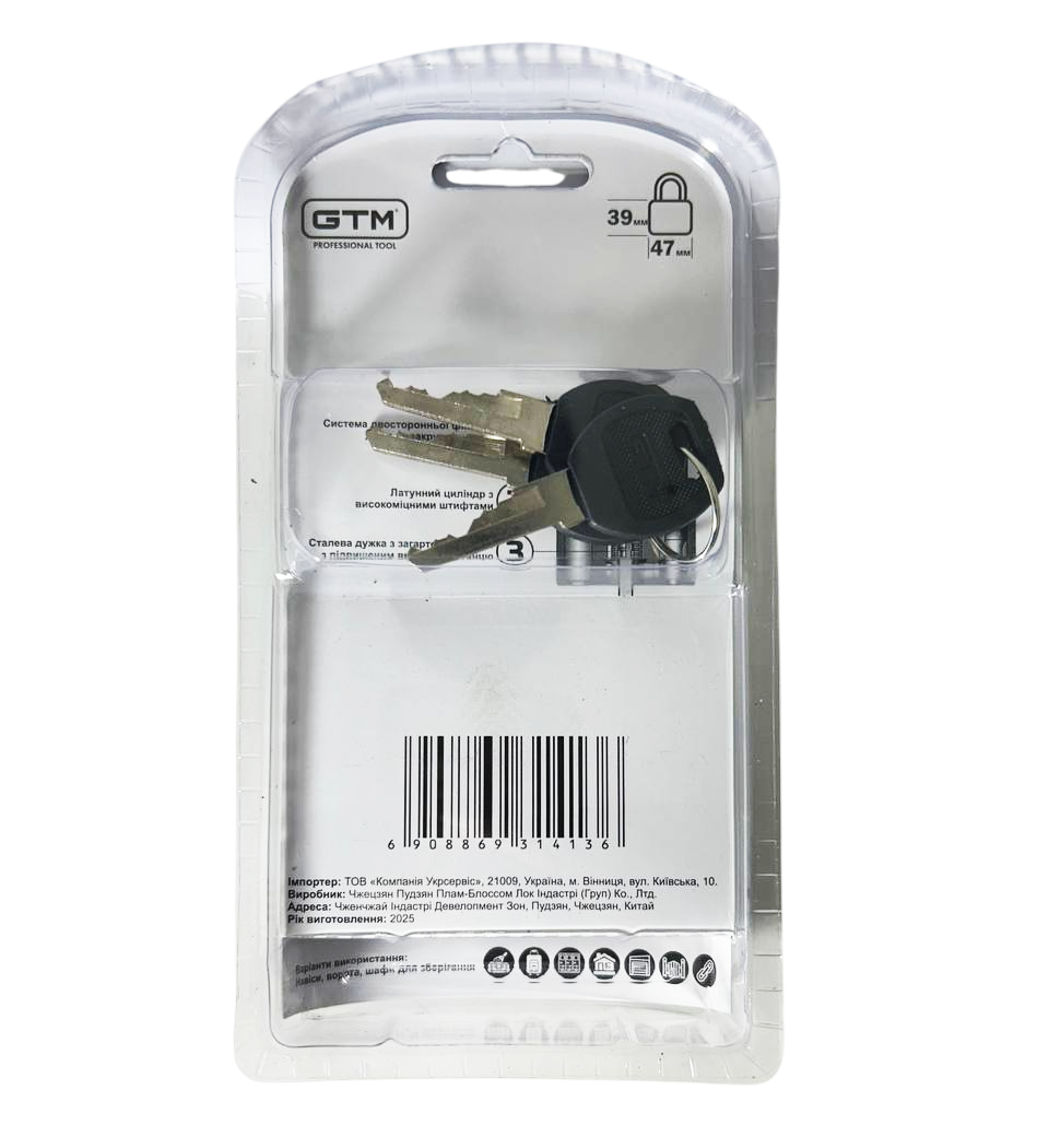 GTM - власна торгова марка ТД "Укрсервіс". На етапі розробки кожна модель навісних замків GTM проходила випробування в Україні в реальних умовах використання. Тому саме інженери GTM вносили необхідні зміни в конструкцію замків, удосконалюючи її та забезпечуючи триваліший термін експлуатації за будь-яких умов. Саме такою модернізацією є додаткове захисне покриття замку: для уникнення пошкоджень поверхні самого замикального пристроя та дверей замки оснащуються додатковим пластиковим покриттям і гумовим чохлом.