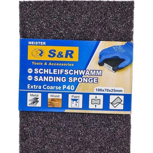 Губка шлифовальная S&R 100х70х25 мм зерно 40 – абразивная губка для шлифовки металла, дерева, снятия лако-красочных покрытий.