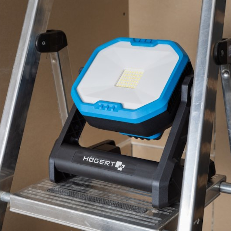 Устройство для освещения больших площадей при проведении малярных, ремонтных и других работ. Отлично подходит для использования на стройке и в мастерской. Возможность питания как от аккумулятора, так и от сети обеспечивает высокую автономность и универсальность применения. Поворотная головка с углом работы 360° направляет свет в выбранную точку. Три режима освещения — 100%, 50% мощности и вспышка — позволяют адаптировать прожектор под конкретные задачи. Максимальная мощность 2400 лм обеспечивает высокий световой поток. Работа до 7 часов с аккумулятором 4 А·ч позволяет длительно использовать устройство без подзарядки.