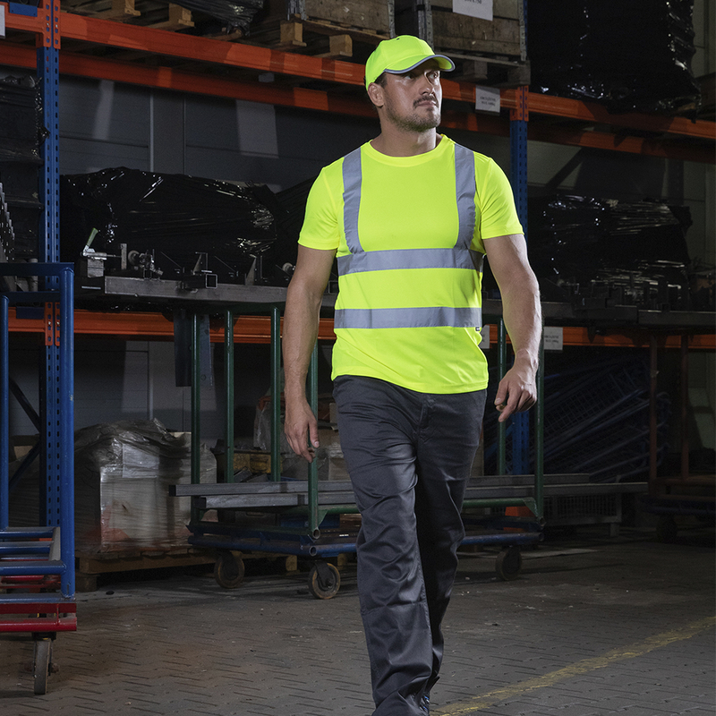 Футболка повышенной видимости. Он изготовлен из высококачественного полиэстера, который пропускает воздух и приятен на ощупь. Свободный крой не стягивает фигуру и обеспечивает полную свободу движений. У футболки короткие рукава и круглый вырез горловины (U-образный). Футболка имеет 2 светоотражающие полосы вокруг тела и 2 светоотражающие полосы на плечах для обеспечения видимости в неблагоприятных условиях. Желтая защитная одежда имеет широкое применение на автомобильном транспорте, в промышленности и сфере услуг.