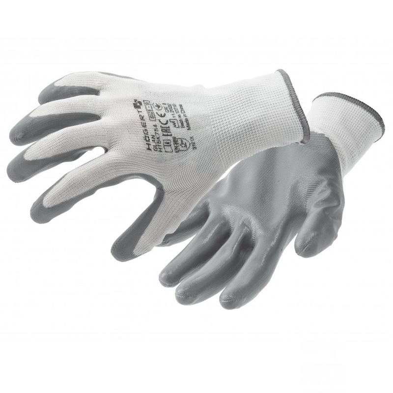 ХарактеристикаМатериал: полиэстеровое трикотажное полотно.Верхняя и рабочая часть покрыты нитриловым слоем.Устойчивость к разрывам и проколам.Заканчиваются трикотажной манжетой.Отличное сцепление и тактильная чувствительность.Противоскользящее покрытие предотвращает выскальзывание инструментов при работе.Безопасны для окружающей среды — нитрил является биоразлагаемым материалом.Соответствуют стандартам EN ISO 21420, EN 388-3121X.