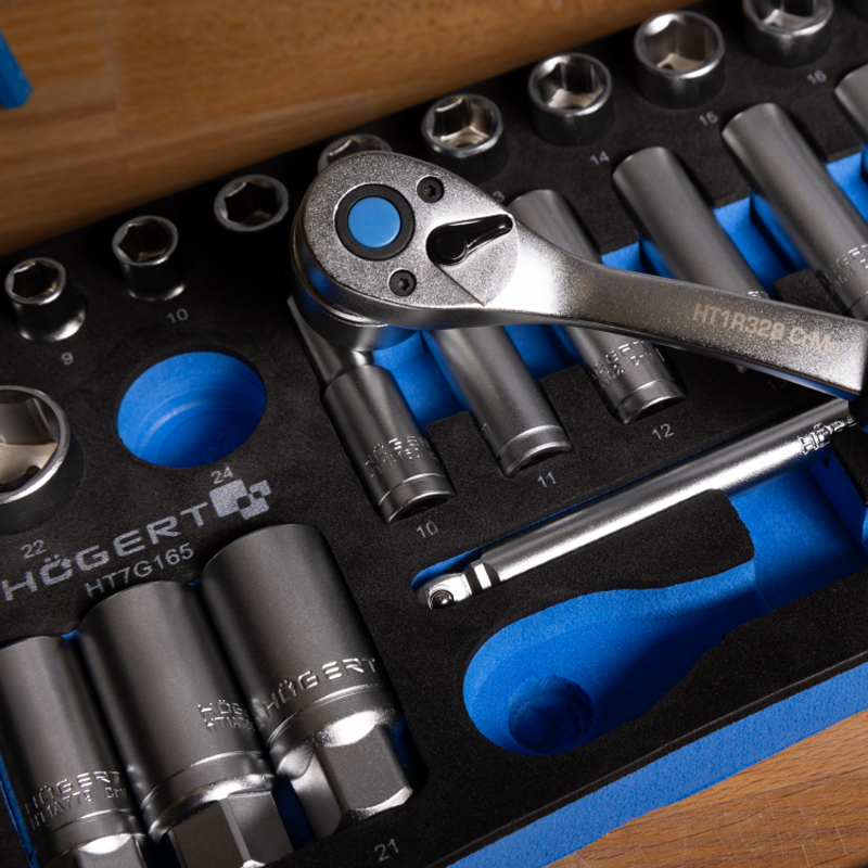 Описание HOEGERT Набор инструментов с трещоткой 3/8", 33 шт., ложемент EVA код товару HT7G165
