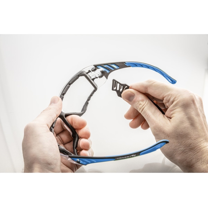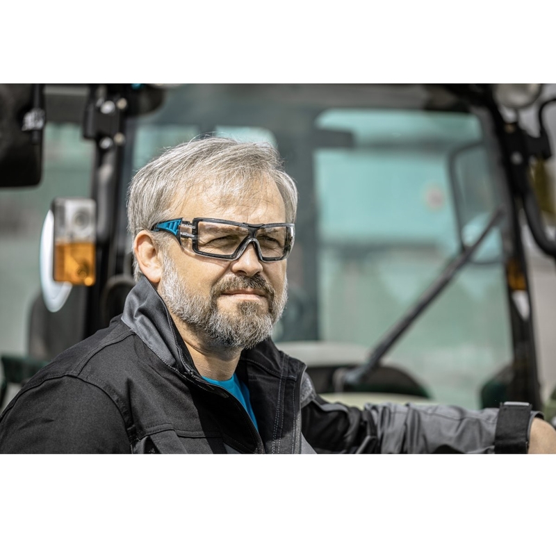 Очки, предназначенные для индивидуальной защиты глаз от механических повреждений. Соответствуют стандарту EN 166:2001. Линзы очков изготовлены из прозрачного профилированного поликарбоната, поэтому обеспечивают боковую защиту глаз и висков. Мягкая подкладка вокруг линз и съемный ремешок предотвращают скольжение очков. Дужки изготовлены из поликарбоната, а кончики дужек — из высококачественного материала TPR (термопластичная резина). Кроме того, дужки снабжены специальными вентиляционными каналами, предотвращающими запотевание линз. Очки защищают от низкоэнергетического выкрашивания твердых тел, образующихся при шлифовке, сверлении, резке, распиловке и дроблении. Они идеально подходят для типовых работ в промышленности и сфере услуг, строительстве, в мастерских, лесном хозяйстве, на технических или коммунальных работах. Изделие можно использовать с корректирующими очками. Они не подходят для использования во время сварки.