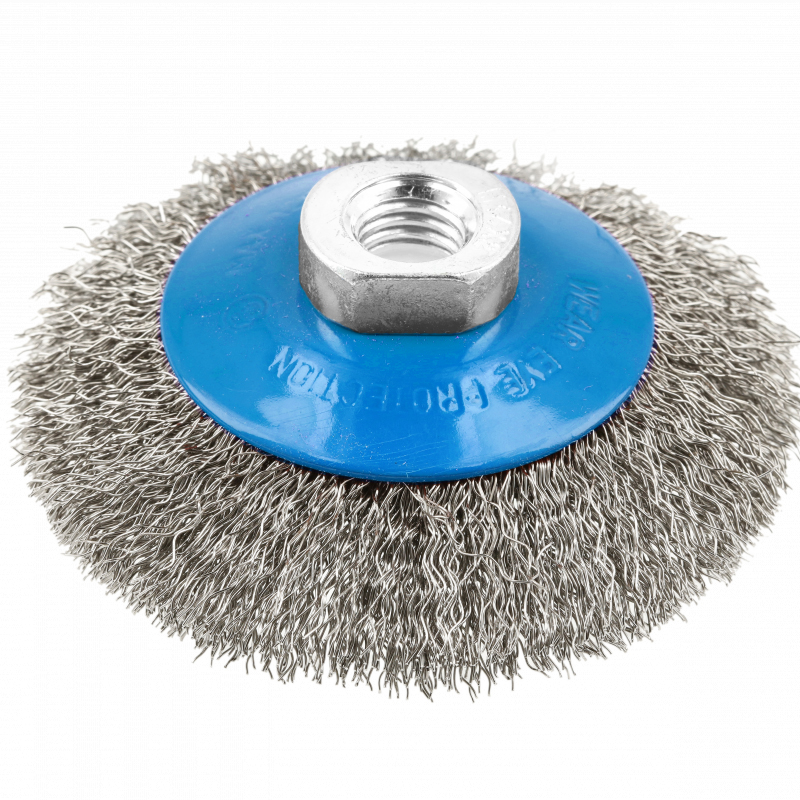 Характеристикадля угловых шлифовальных машин;проволока из нержавеющей стали;оснащена плотной высококачественной проволокой для высокой производительности при очистке и других работах;диаметр проволоки 0,3 мм;макс. скорость 12500 об/мин;крепление M14для сложной очистки плоских поверхностей.