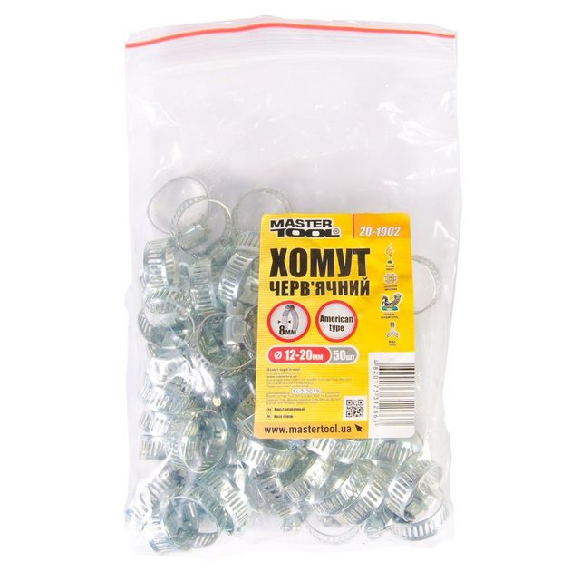 Характеристики Хомут червячный оцинкованный MASTERTOOL American тип 8.0 мм Ø12-20 мм код товару 20-1902
