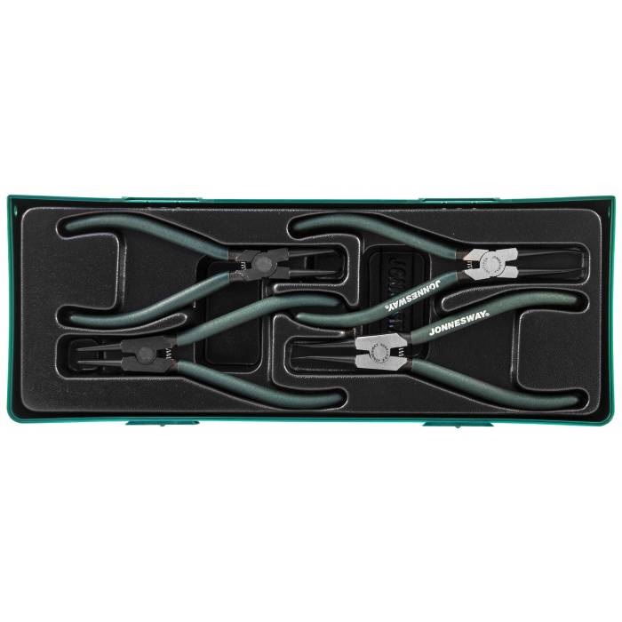 Универсальный набор щипцов JONNESWAY для стопорных колец – это специальный вид плоскогубцев, используется при ремонте автомобилей и другой техники. Одна пара щипцов предназначена для снятия внутренних стопорных колец, другая для внешних колец.
