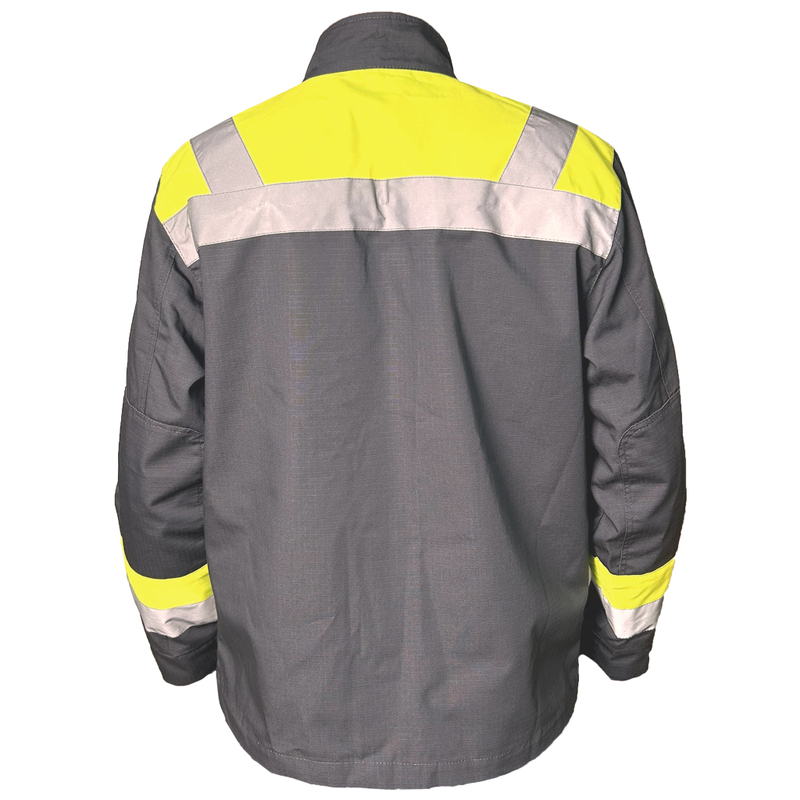 Куртка удлинена прямого силуэта. Воротник стойка, по переду с центральной застежкой, молния металлическая (80 сантиметров), ветрозащитной планкой, которая застегивается на 4 металлические кнопки YKK (или релевантные по качеству). Пелочки с отрезными кокетками контрастного (ярко-желтого) цвета, на нижней части которых настроена светоотражающая лента – шириной 5 см. Под левой кокеткой нашита липучка лента шириной 1,5 см., длиной 12,5 см. для лотготипа компании заказчика. На спинке отрезная кокетка желтого цвета, на нижней части настроена световозвращающая лента 4 см шириной. Рукав двухшовный с усиливающей накладкой на локоть, низ рукава манжет с текстильной застежкой (липучкой). Размеры текстильной застежки 13см*2,5см. Над манжетом настроены две ленты из контрастной ткани и светло отражающей ленты шириной 5 см. Все швы с двойной строчкой. На подкладе куртки расположены три внутренних кармана, которые застегиваются на текстильные застежки. Размеры текстильной застежки 10см*2,5см. Один карман расположен в правом внутреннем нижнем углу. Второй карман размещен в левом внутреннем нижнем углу. Третий внутренний карман размещен на уровне груди с левой стороны. Низ куртки обработанный швом подгиб 2,5 см.
