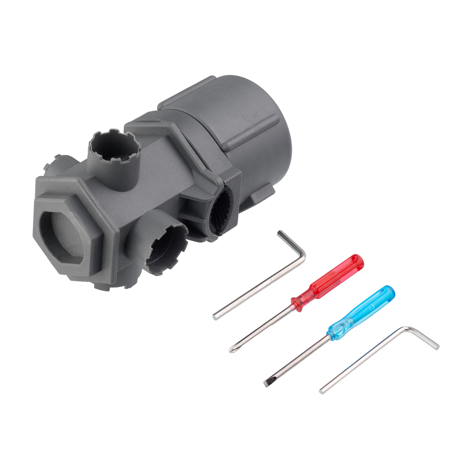 Благодаря универсальной конструкции ключ подходит для большинства стандартных аэраторов с внутренней и наружной резьбой. Изготовлен из прочного пластика, не повреждает хромированное и декоративное покрытие смесителя при работе. В комплект входят вспомогательные инструменты, которые упрощают процесс снятия даже плотно зафиксированных аэраторов.