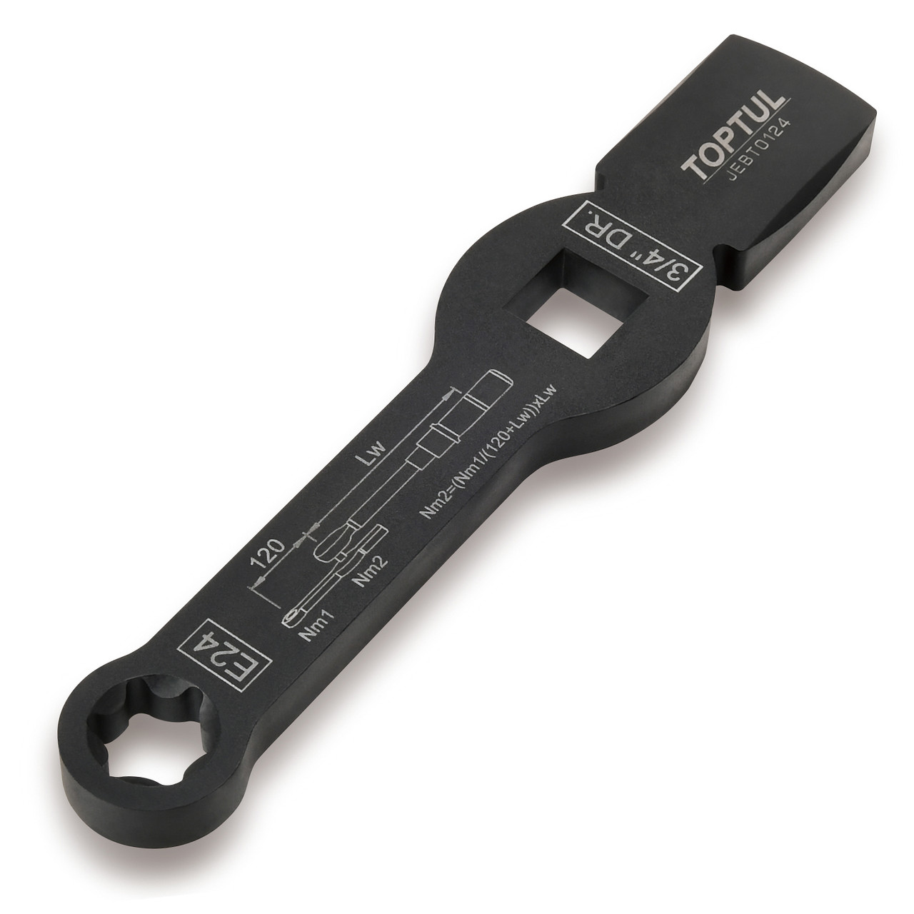 TOPTUL JEBT0124 — специализированный ударный ключ с профилем E24 и квадратом 3/4", предназначенный для демонтажа и монтажа тормозных суппортов на коммерческих автомобилях MAN TGA/TGS/TGX без необходимости