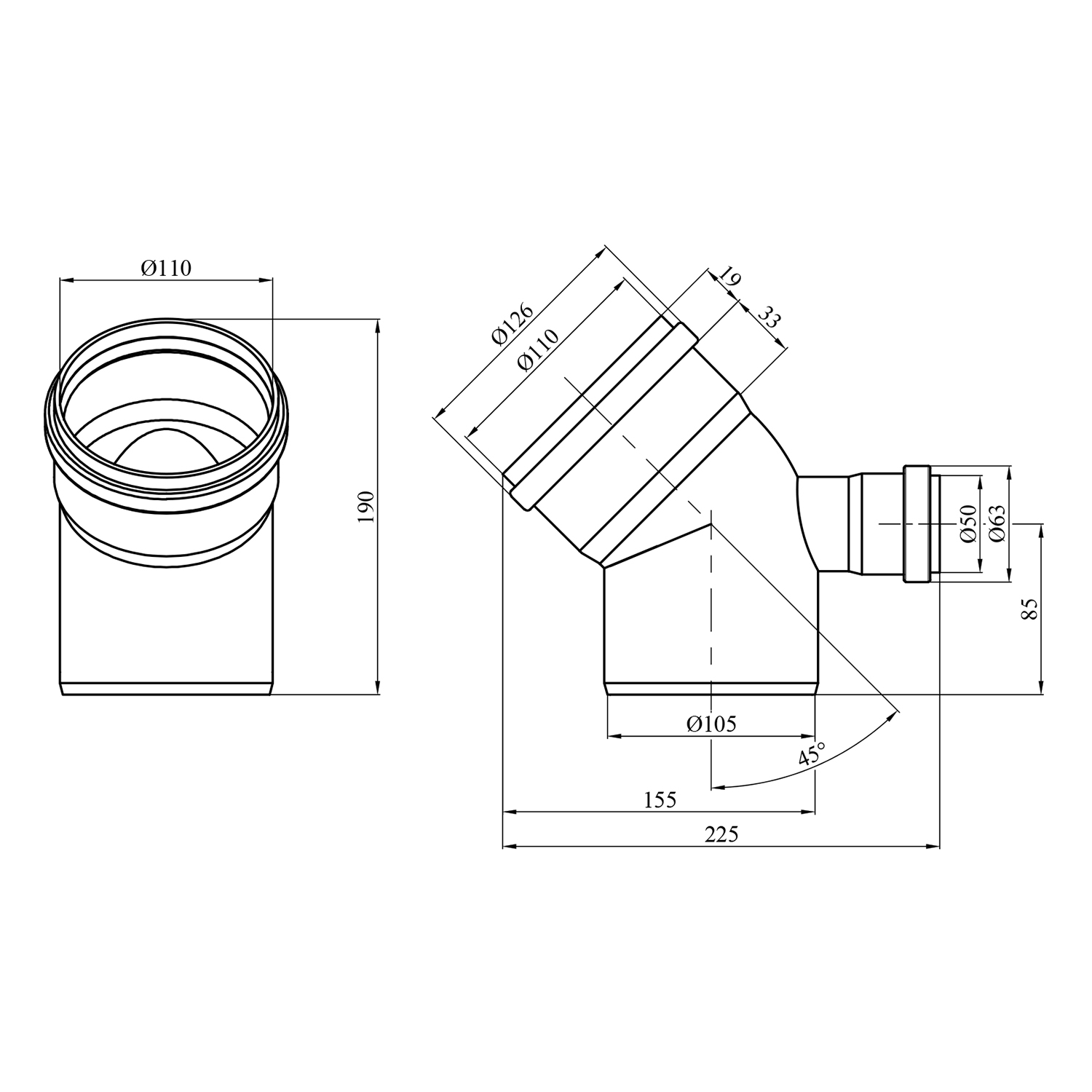 Характеристики Колено Rozma 110х45° с отводом 50 мм назад для внутренней канализации код товару CV029907