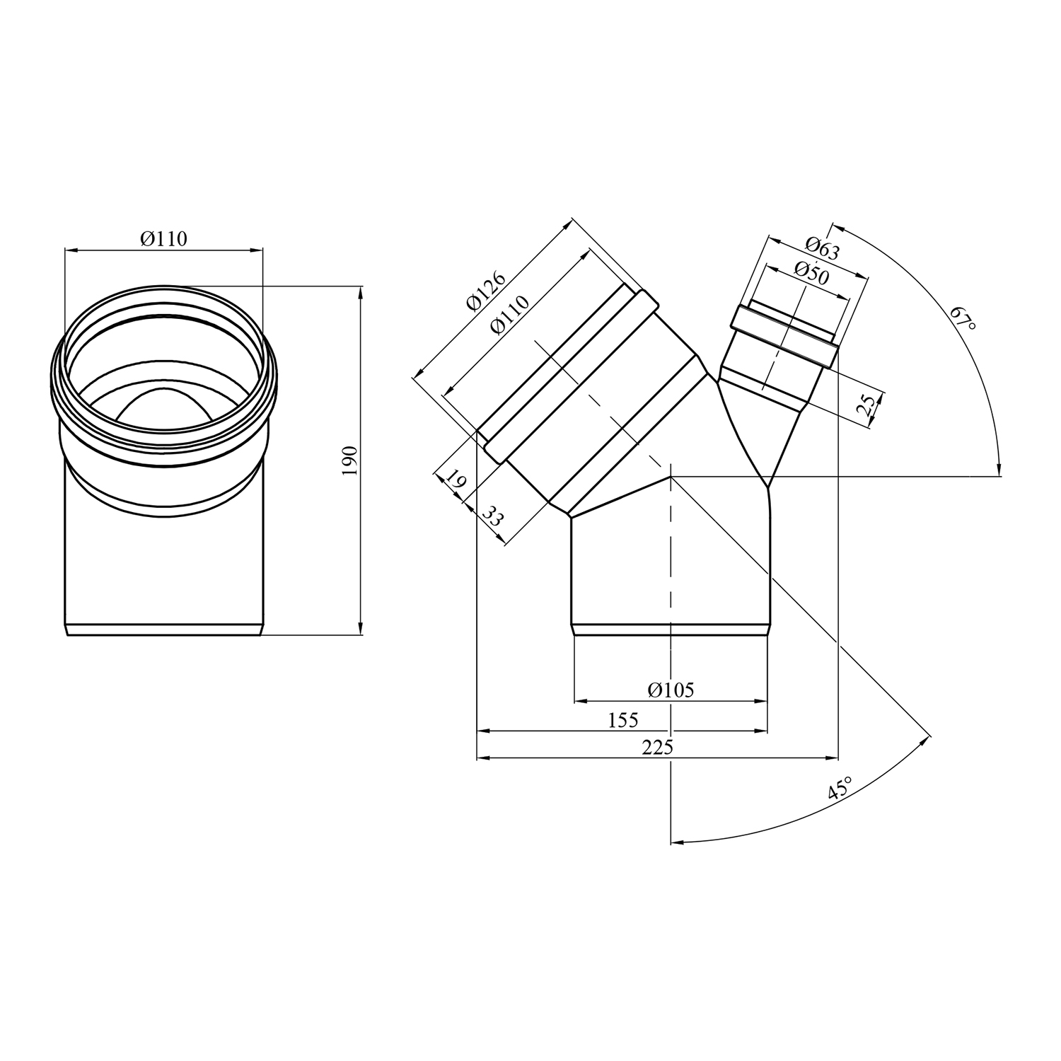 Характеристики Колено Rozma 110х45° с отводом 50х67° для внутренней канализации код товару CV029908