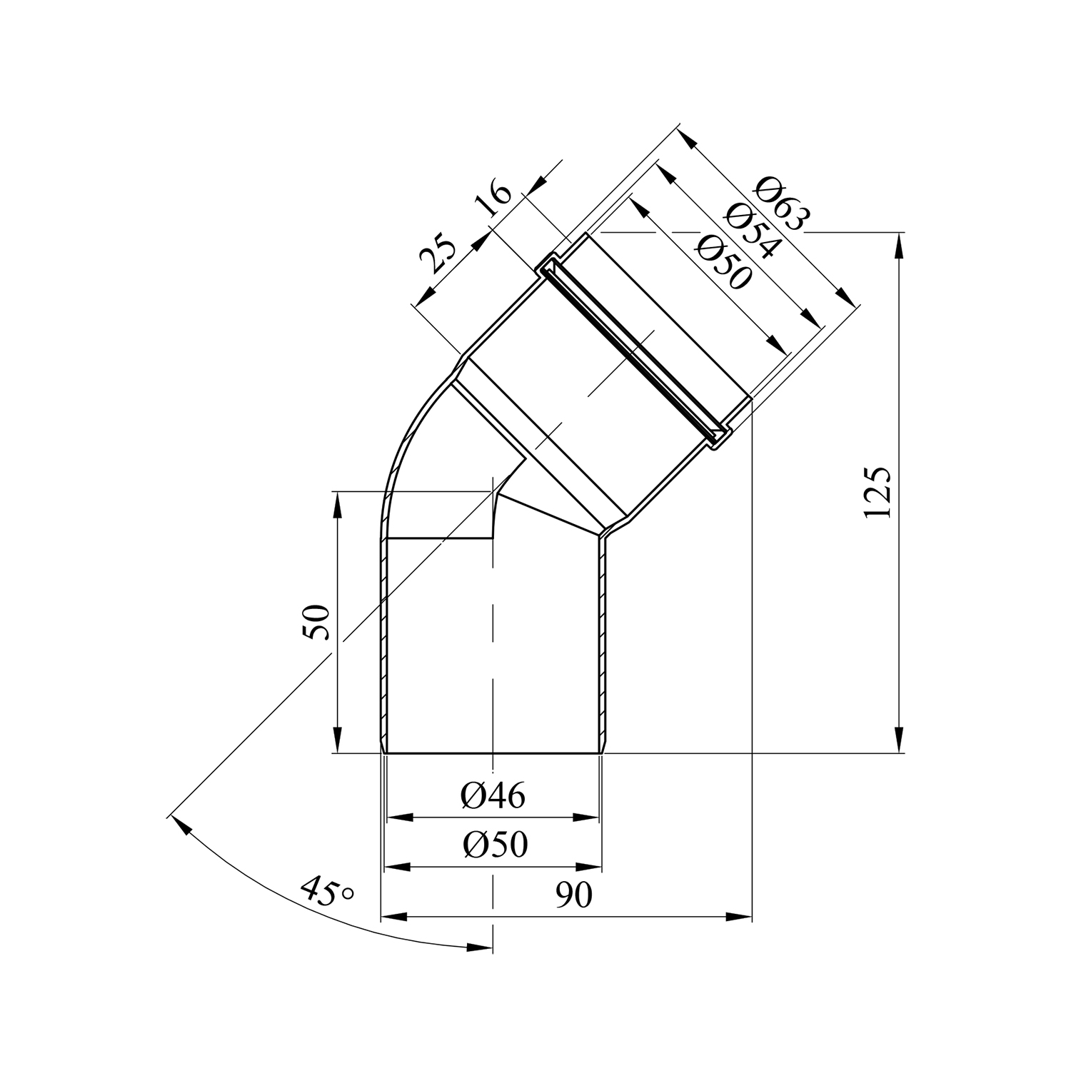 Характеристики Колено Rozma 50х45° для внутренней канализации код товару CV016949