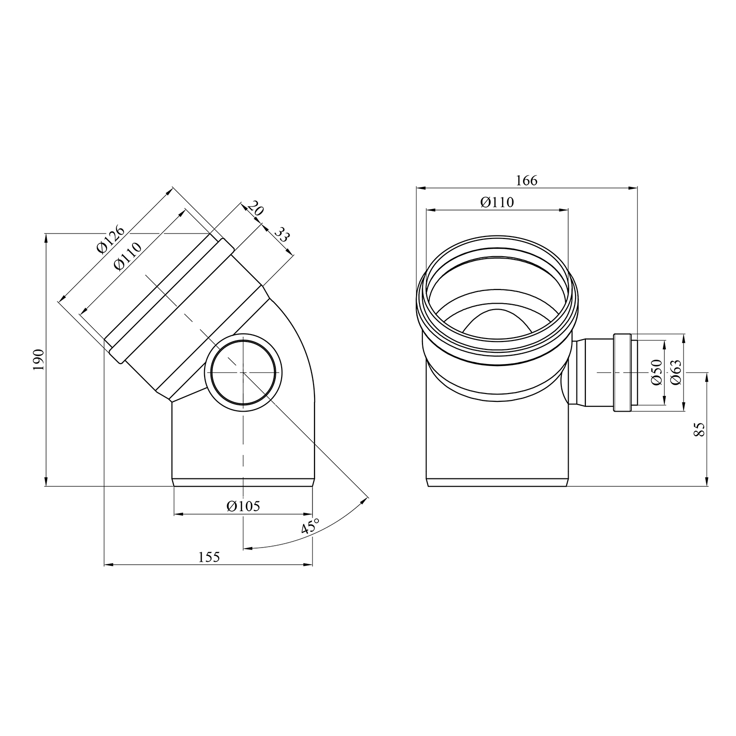 Характеристики Колено Rozma 110х45° для внутренней канализации с отводом вправо код товару CV029895