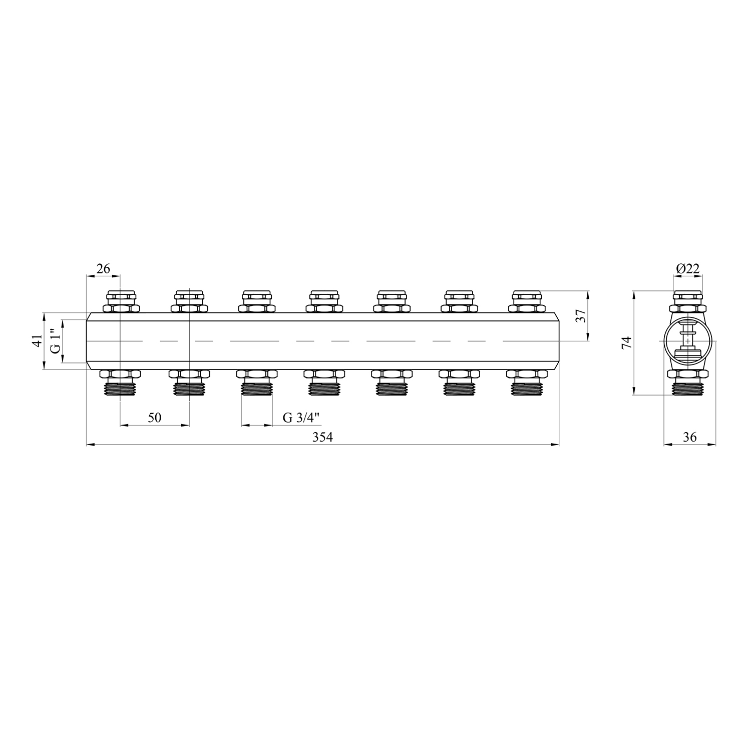Характеристики Регулирующий коллектор Karro 7 выходов 1x3/4 с вентилем, латунный код товару CV018997