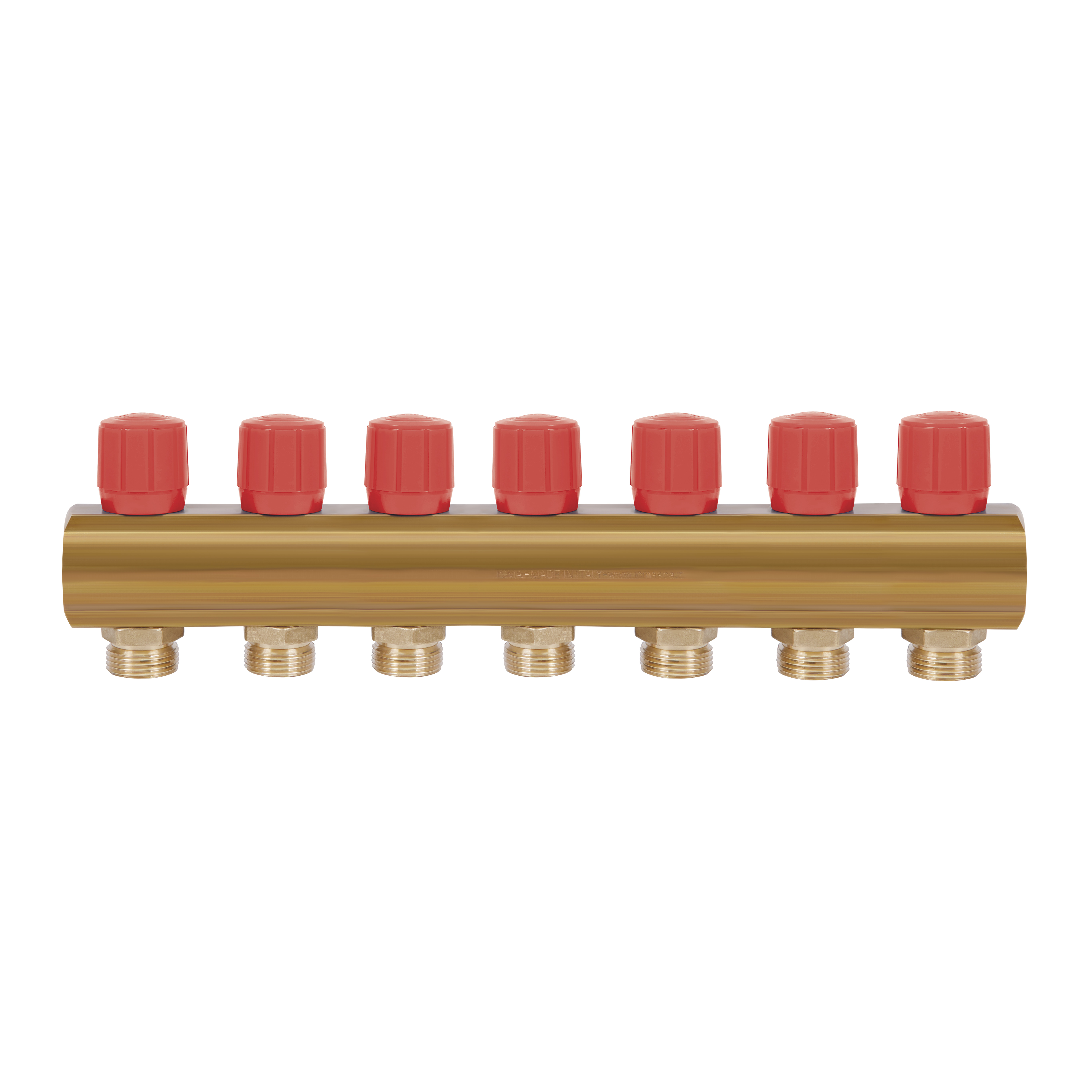 Коллектор Icma с регулировочными вентилями 1" 7 выходов №1105 (Red) сделан из латуни, ручки ручной регулировки — красного цвета. Такая гребенка позволяет подсоединить к системе ГХВС семь линий, ведущих к точкам потребления воды (смесители, посудомоечные машины, душевые кабины и др.). Выходы для подсоединений снабжены наружной резьбой 3/4". Преимущества распределительного коллектора — возможность организовать равномерную подачу к точкам разбора, уменьшение количества соединений.